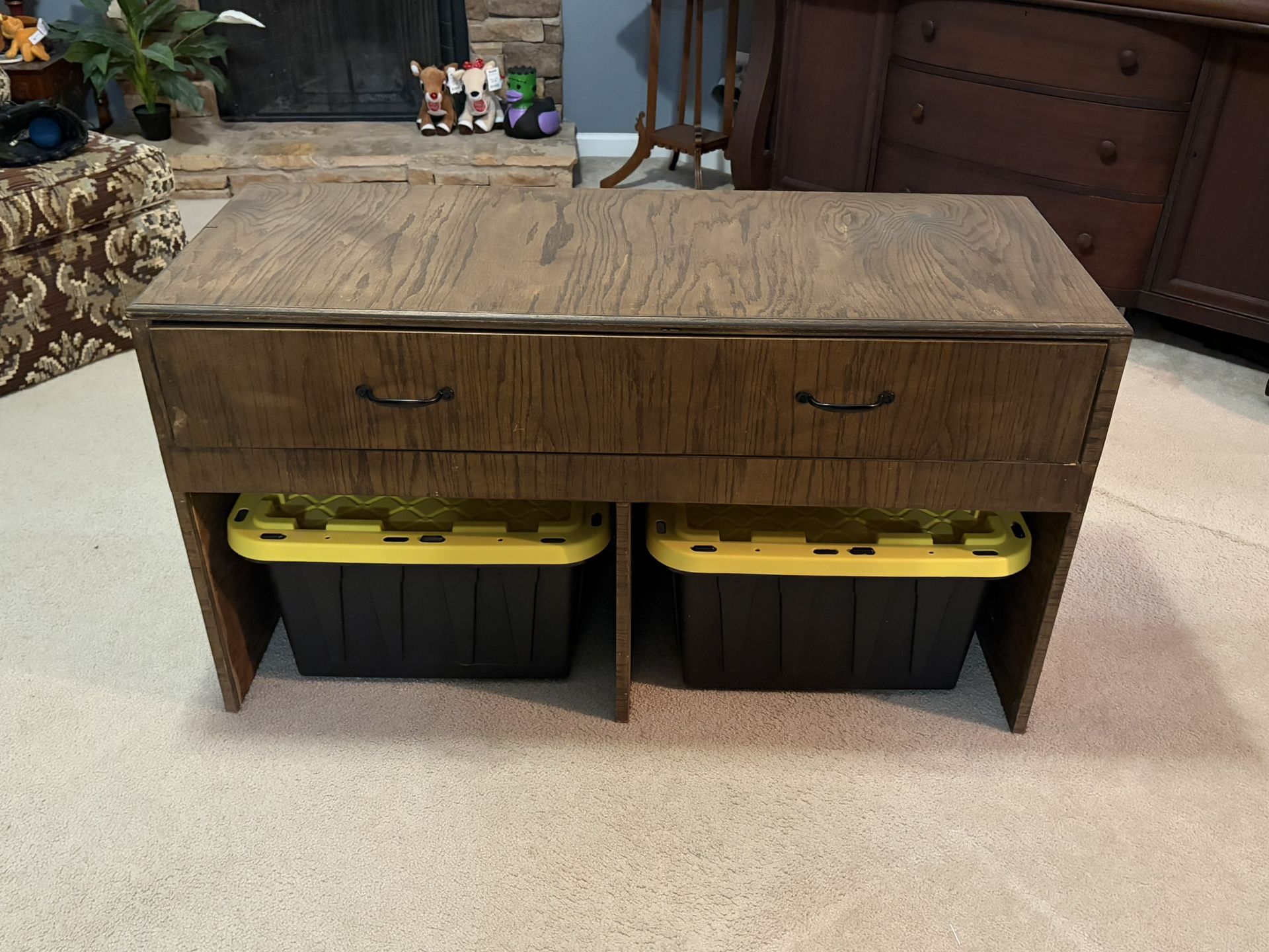 Children’s Toy Storage Chest/Play Table Handmade custom play table with removable storage bins that slide out and a long sliding drawer. My husband made this for our son to store and build legos. In good preowned condition. Heavy and solid construction. Please see photos for measurements Smoke & pet free home Pickup only - located in Jefferson, Ga