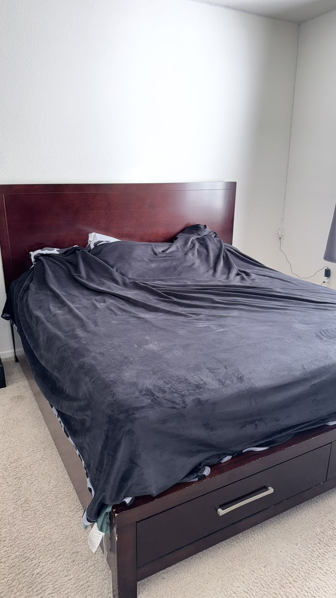Headboard wooden bed frame with 2 drawers, mattress, 6 drawer dresser, 2 drawer night stand. Mattress in excellent condition. ALWAYS had premium mattress cover on it since purchase. Pick up in Mira Mesa Saturday Dec 20 or Sunday Dec 21. $250/OBO