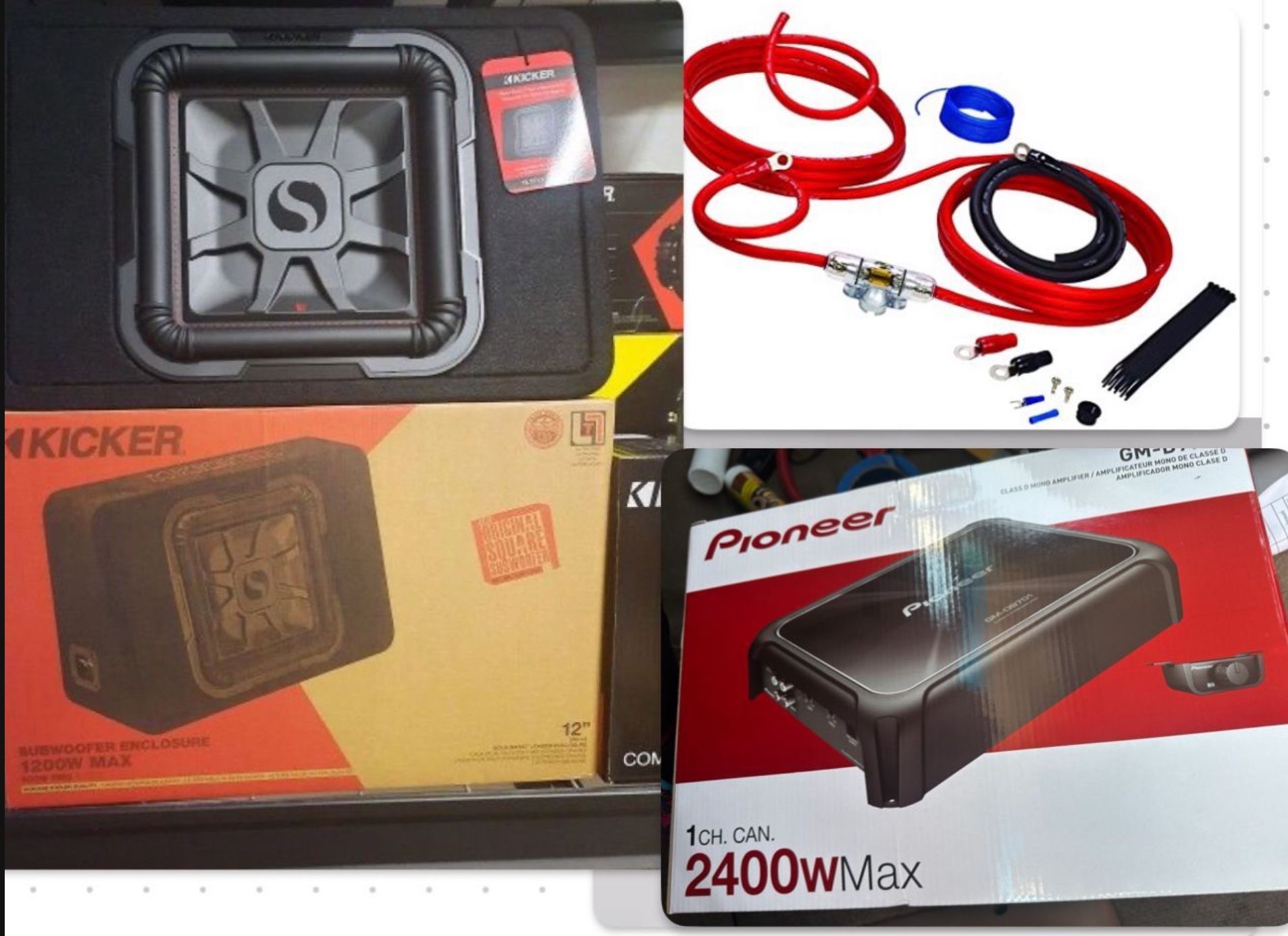 $550 New Labor installation included Fits almost any car or truck 1 12” kicker l7t subwoofer 1200 watts Slim box Pioneer amp 2400 watts. With bass knob control Amp kit wires Installed Keywords alpine kenwood pioneer kicker Rockford Memphis mtx jl audio hifonics sundown audio skar audio