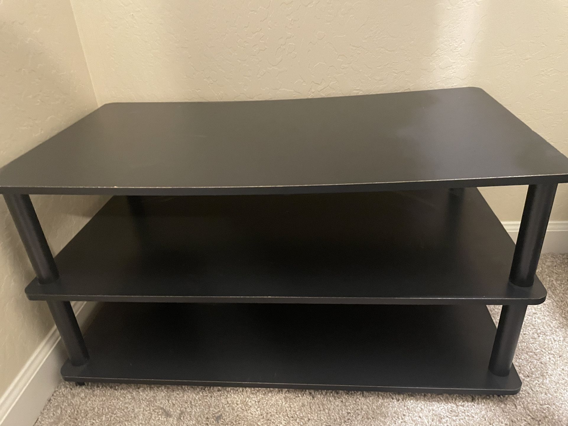 Black TV stand which can also be used as storage. 3 years old. Selling for 20. Height-15 1/2 inches. Length-29 inches. Width-16 inches