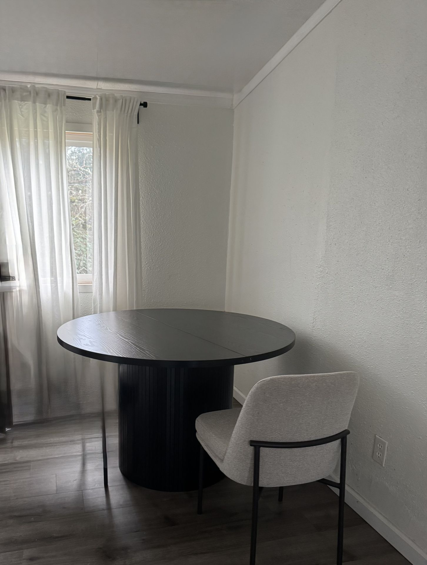 Solid wood table. Dimensions 29.52'' H X 47.24'' W X 47.24'' D Brand new, too big for our small space.