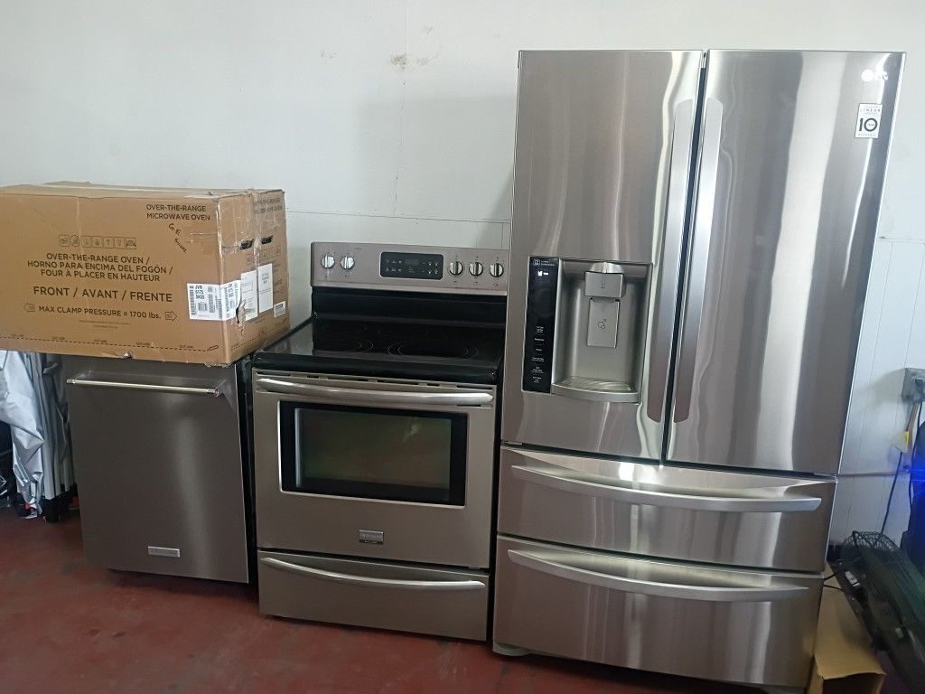 Stainless Appliances Delivery Available for small fee, Fridge is 35 1/2 inches wide 32 inch deep 68 1/2 tall Stove is 30 " Microwave is 30 " Dishwasher is 24" wide