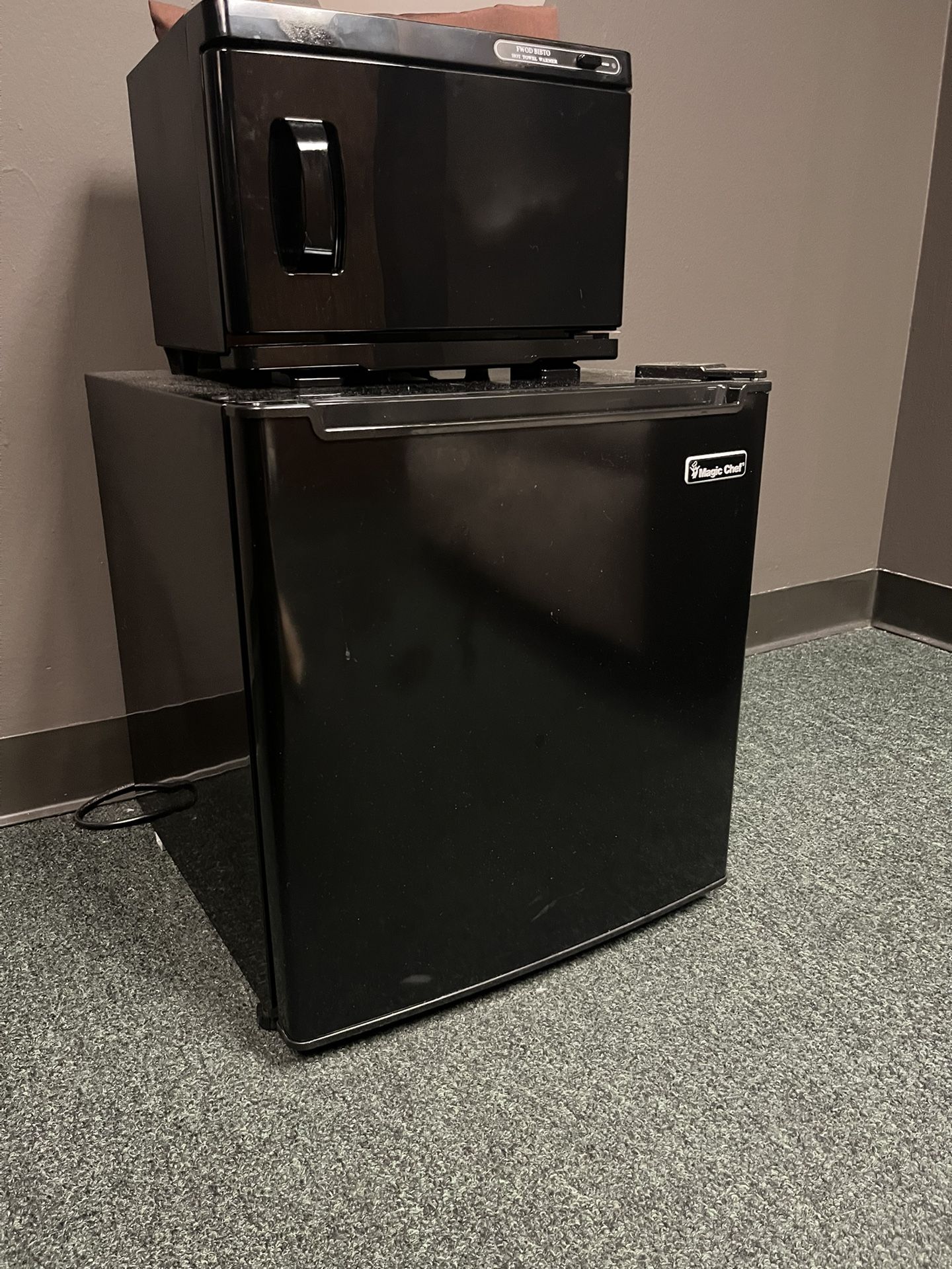 Compact Magic Chef mini refrigerator, perfect for a bedroom, office, dorm, massage studio, or small apartment. Works great and keeps drinks and snacks cold. • Compact size • Black finish • Great for office or dorm • Energy efficient