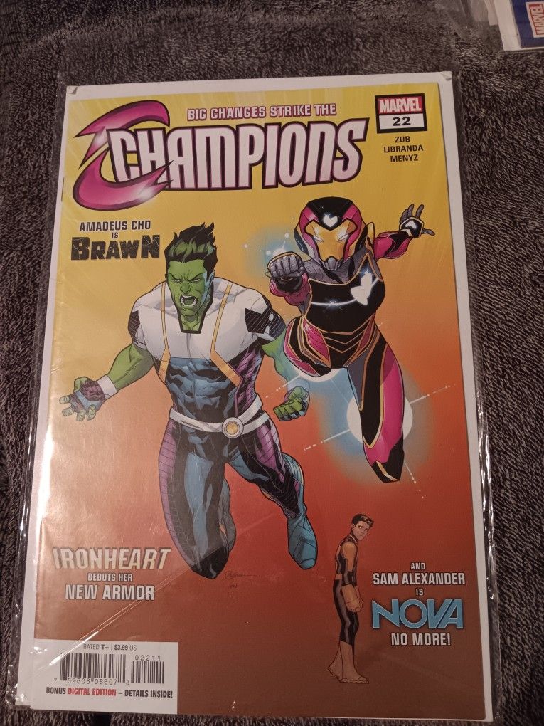Champions #22 (2018) First Appearance: Brawn (Amadeus Cho) π Publisher: Marvel Series: Champions (2016) Genre: Superhero Character: Champions Artists: Kevin Libranda, Marcio Menyz, Clayton Cowles, Nolan Woodard Writer: Jim Zub