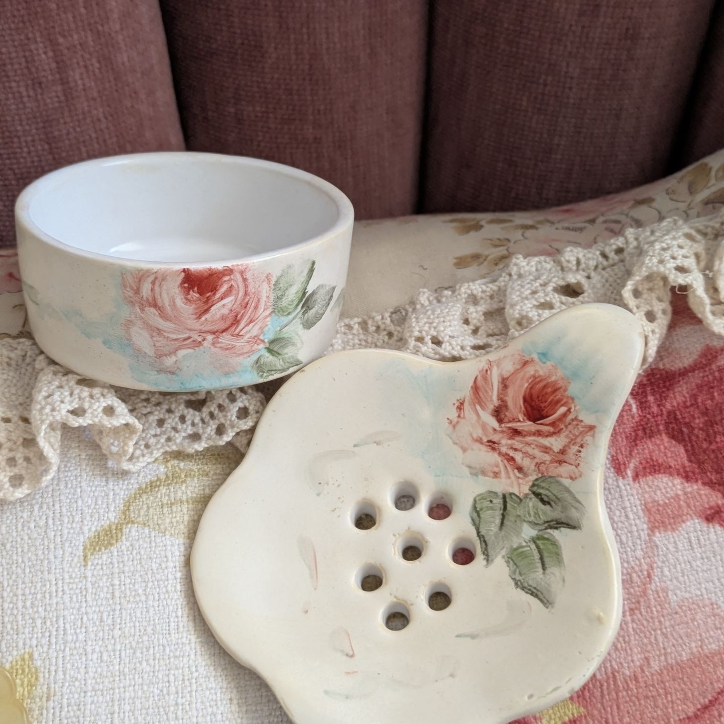 This item is a vintage porcelain tea strainer with a matching base/receptacle. This piece is designed to hold a wet tea bag or strain loose tea. It features a hand painted floral design with delicate pink roses, painted on both the perforated top strainer and the small base. The top piece allows tea to strain or a tea bag to rest while the base collects all of the drips. This tea strainer is unmarked but this type of vintage set is most likely made by companies like England's Crownford or Japan's Nippon and are sought after by collectors of vintage tea accessories and tableware. This item is in very good condition with no damage.The base has a 2.5" diameter & is 1" tall. The top strainer has a 3" diameter scalloped edge & a 1" handle. Very lovely, beautifully hand painted tea strainer set to add to a vintage collection. Available for pickup at my Anaheim home. Cross streets Kraemer and Orangethorpe. $22.