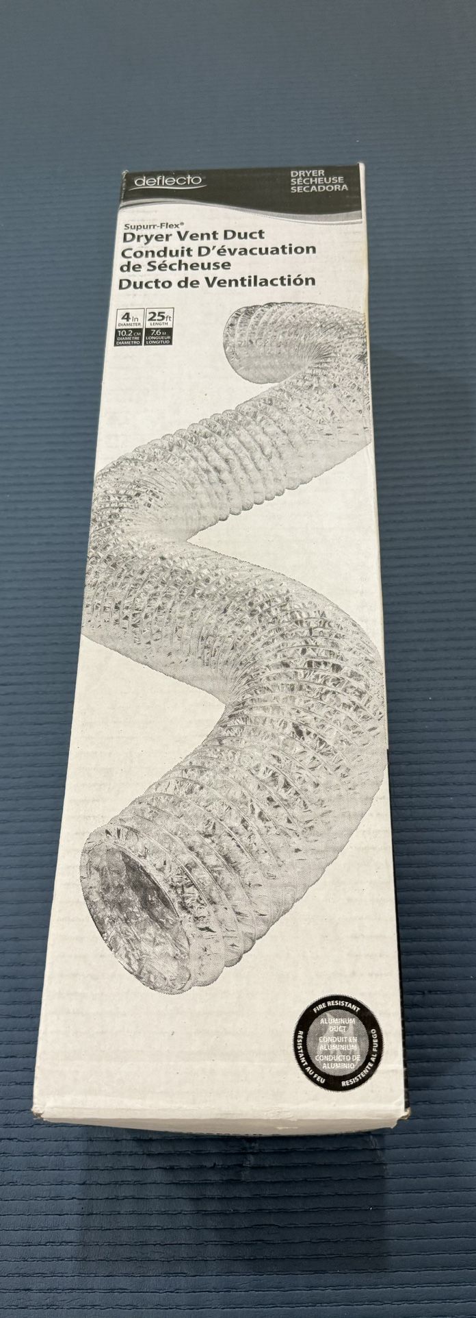 Deflecto 5-ply duct for use with dryers, bathroom vents, HVAC systems & general venting needs. New in box, unopened. 4” diameter x 300” long. Comoresses to 25’ plus or minus 15”.