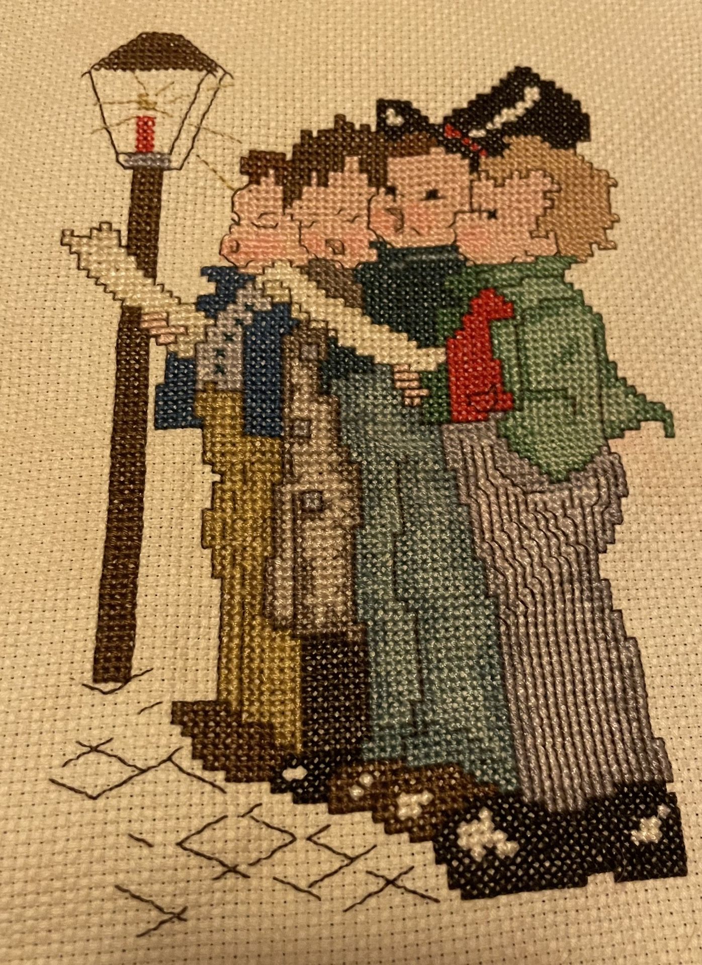 Completed counted cross stitch on ivory Aida cloth of Hummel carolers. Nice handiwork. 9” x 11 1/2”