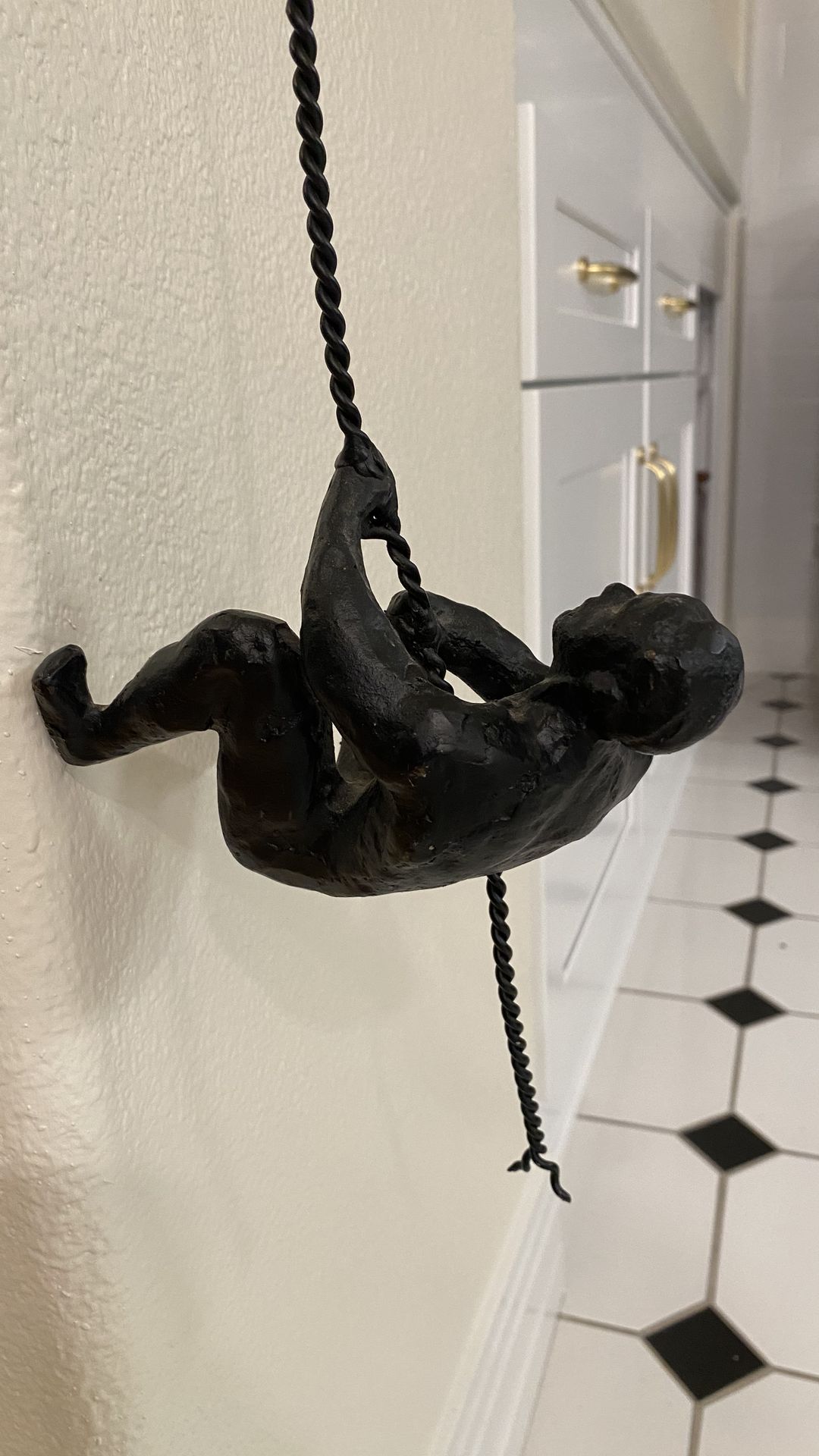 Decorative wall sculpture of a figure climbing rope. Heavy and very well made.