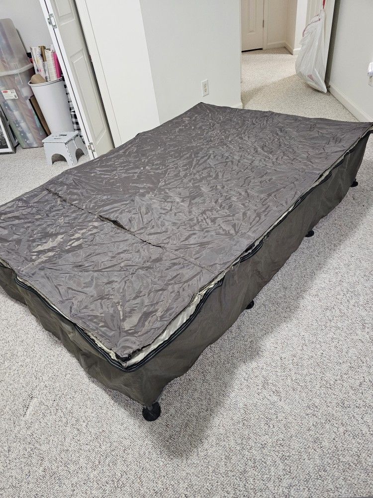 Air mattress platform, portable for indoor or camping. Cover has a couple small tears. 63x50x13.