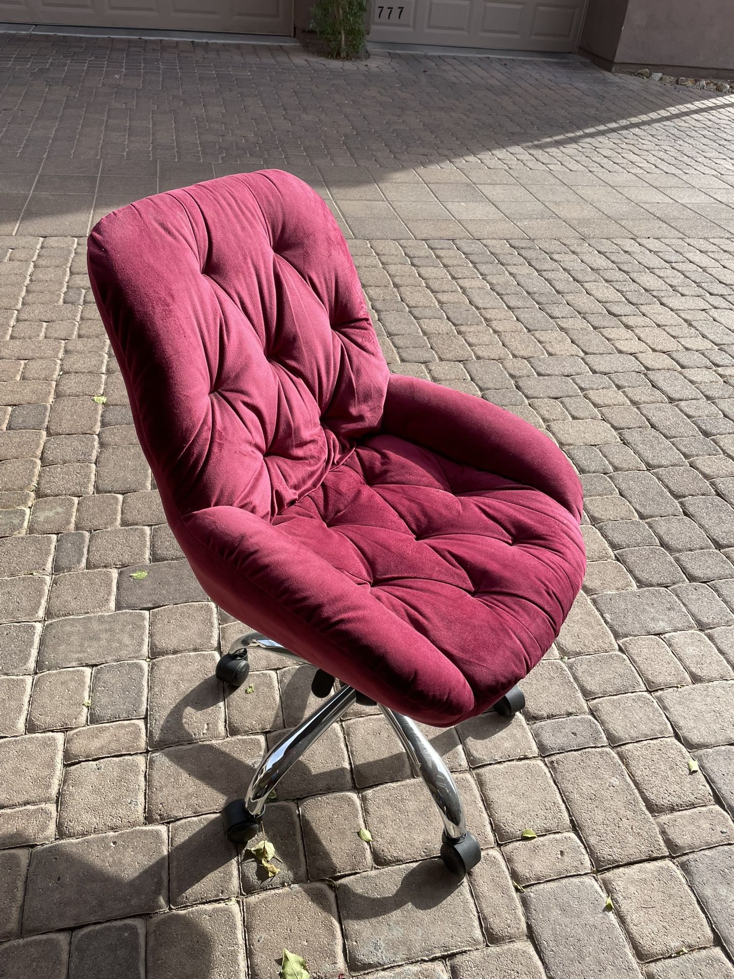 Selling it for my niece she used it as a chair for her make up table. It’s an excellent condition kind of suede velvet material.