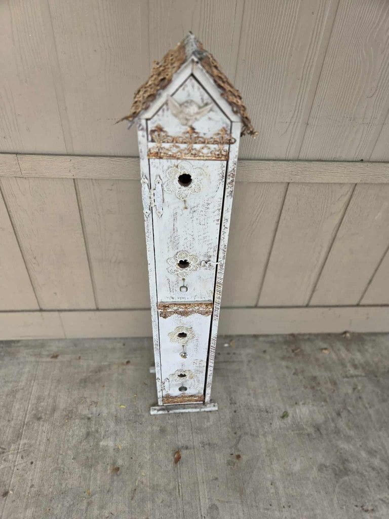 Handmade rustic birdhouse metal roof applique nails and wood. Serious only for meet up and cash only Approximately almost 3 feet tall.