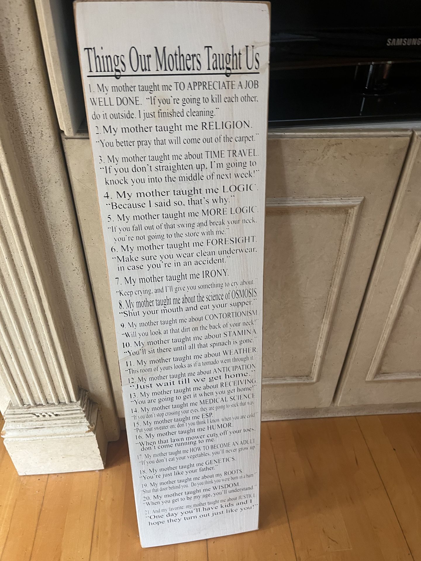 Wooden plaque with old sayings we grew up with from mom. Really conversation piece