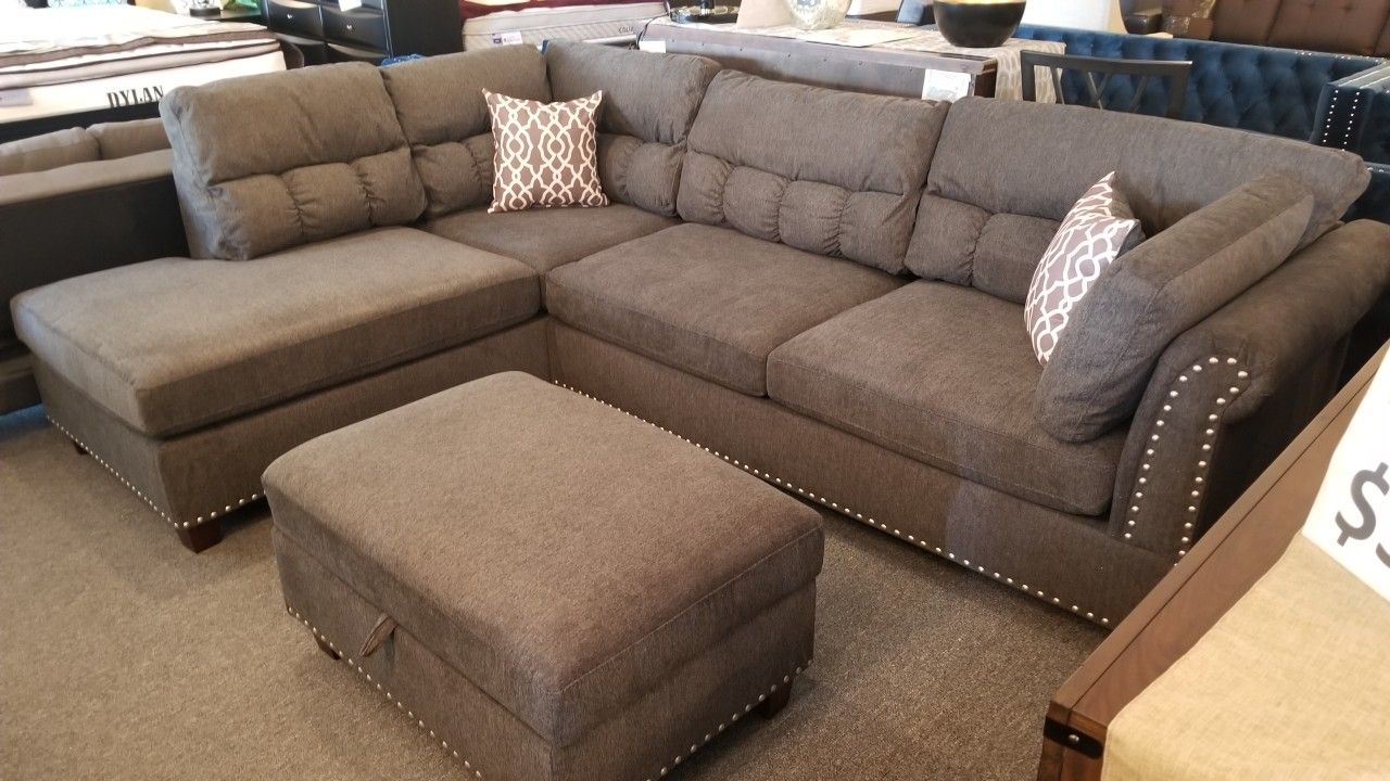 Brand New 104" x 75" Grey Fabric Reversible Sectional + Storage Ottoman