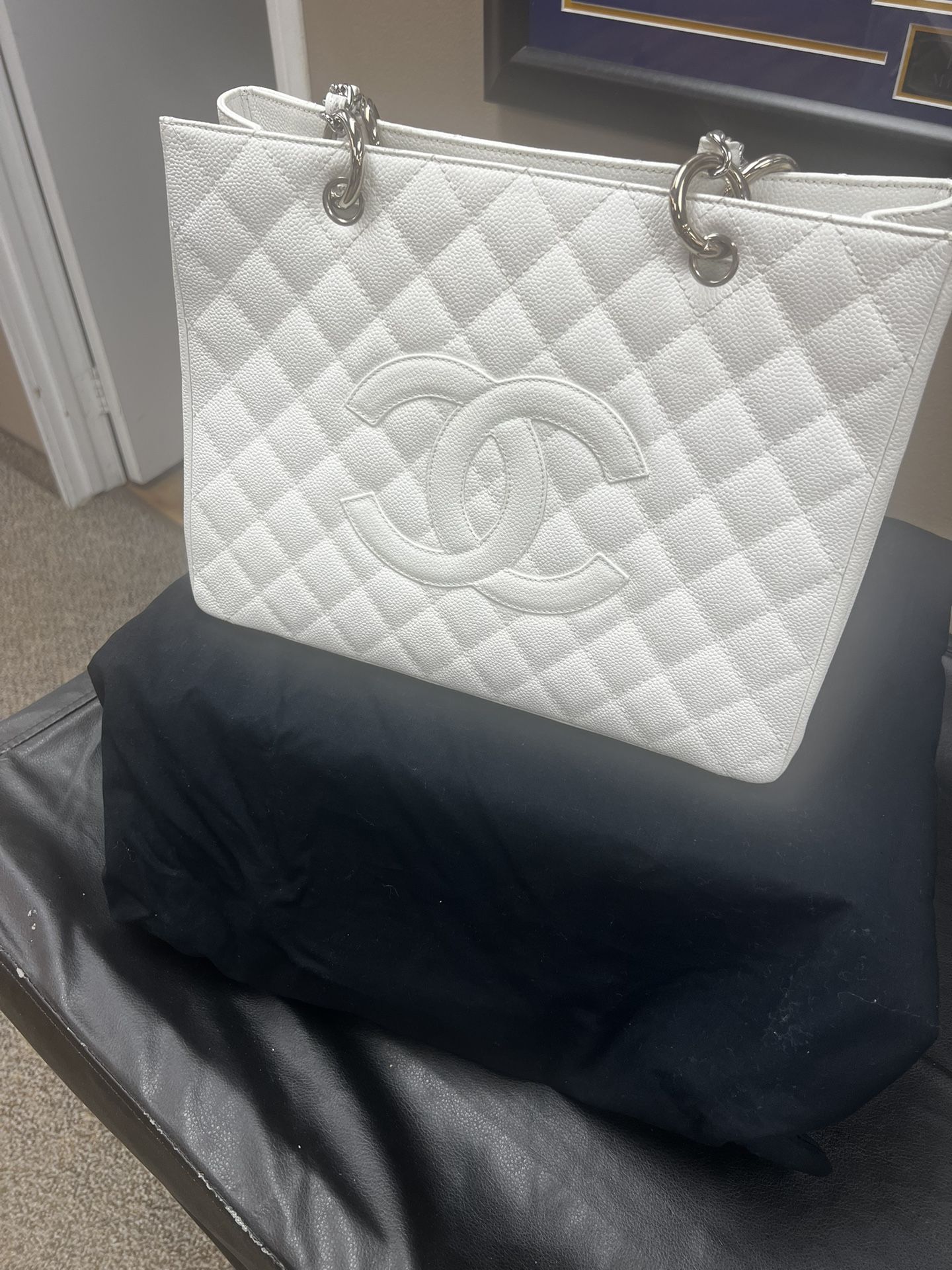 STILL SMELLS LIKE LEATHER! Brand new!! PRISTINE condition! I have an identical black Chanel bag that I have used for over three years. This white one I was saving for special occasions, but never got the chance to use it! Authentic Chanel bag with cloth cover bag and original box!