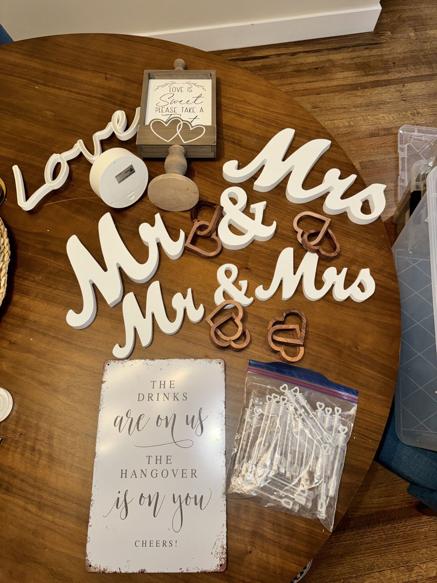 Mr & Mrs sign: small size $10 Starry string lights: three settings, 25 pieces (cool white) $15 4x6 frames: 5 white and 5 gold $12 8x10 gold frames: 2 pieces $2 Bubbles: kids bubble guns (2 pieces) and bubble sticks (20 pieces) $20 Team bride compact mirrors: 5 pieces $10 Welcome to our wedding white sticker lettering $5 (never used) *Goal is to pass onto another bride, everything was just used once for our wedding in June 2024. Would like to sell items all together or in bundles. Prices listed above ⬆️ or BEST OFFER FOR EVERYTHING