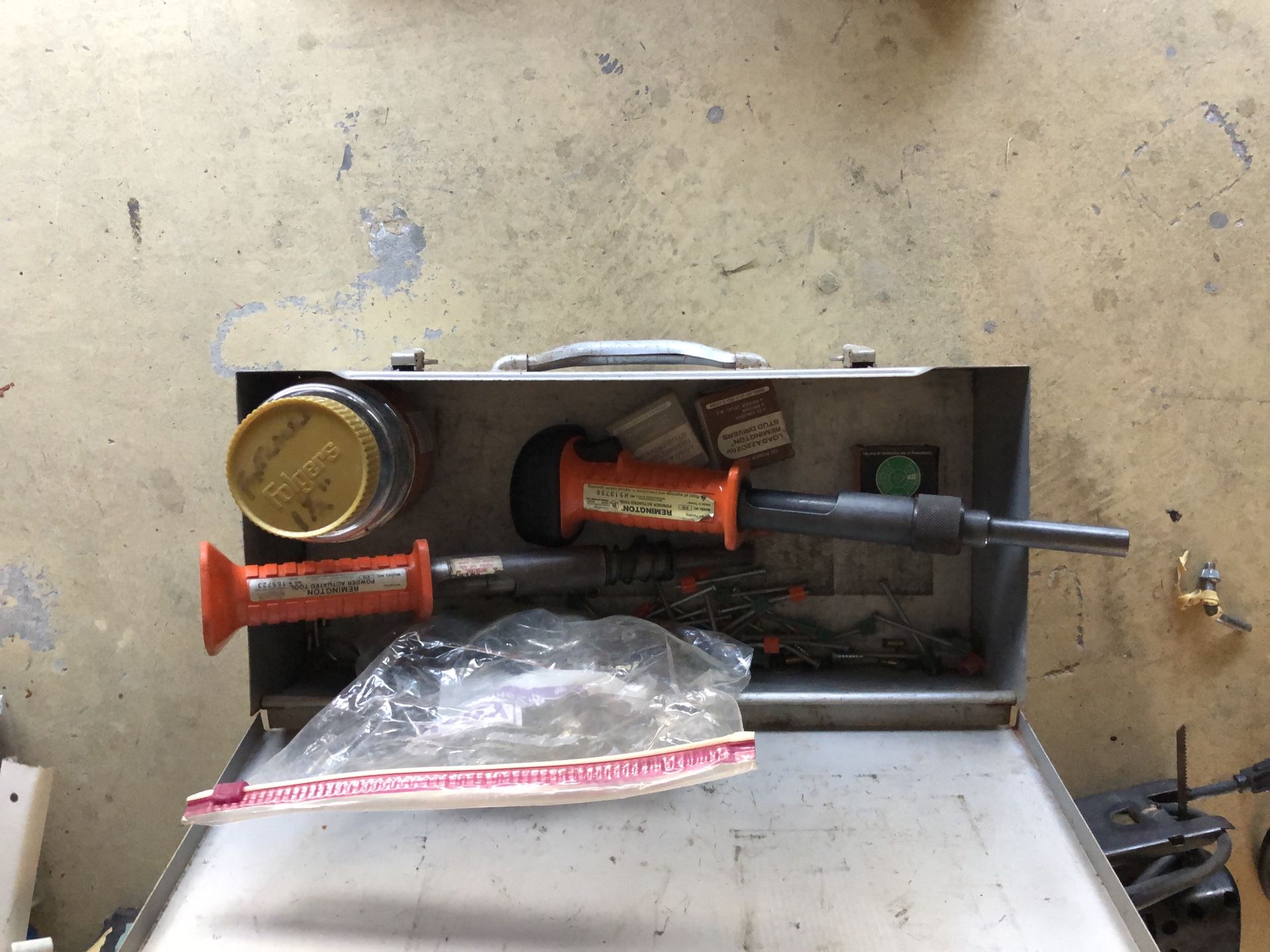 2 power hammers in good working condition with 22 cal shells and some nails. Comes with metal case.