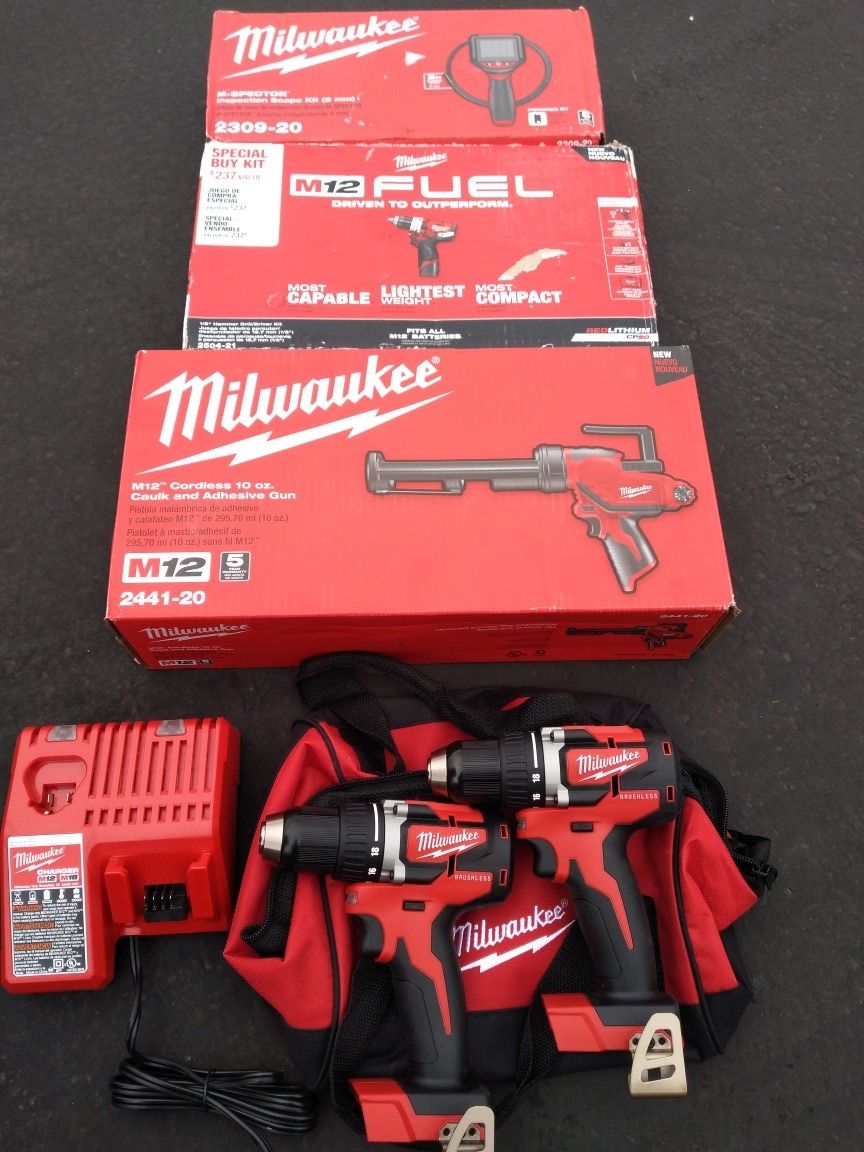 Drills and charger and bag $140 M12 Hammer Drill Kit $100 Caulking Gun $100 Inspection Scope $60 $400 Everything