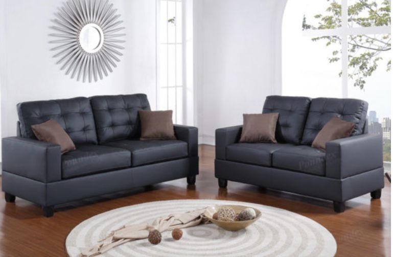 Sofa & Love Seat Item # F7855 Color: Black Accent Pillows Included Light Stitching Accent Tufting Available in Black, Beige and Espresso Materials: Faux Leather Plywood + Solid Pine Foam, Fiber Battings Dimensions: Love Seat 56″ x 35″ x 37″ H 2-seat sofa 72″ x 35″ x 37″ H Some Assembly Required