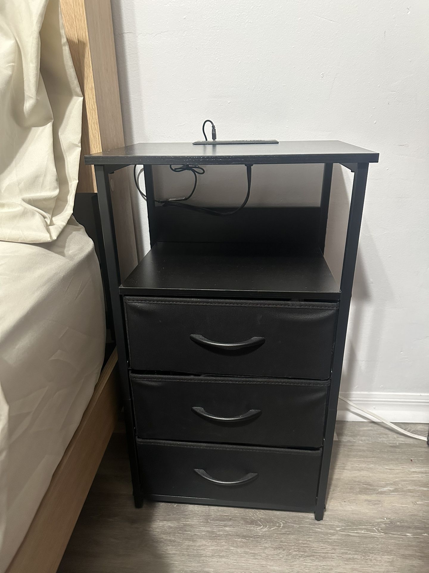 Storage night stand with light strip Comes with control 3 drawers Has power outlet and charging station In brand new condition