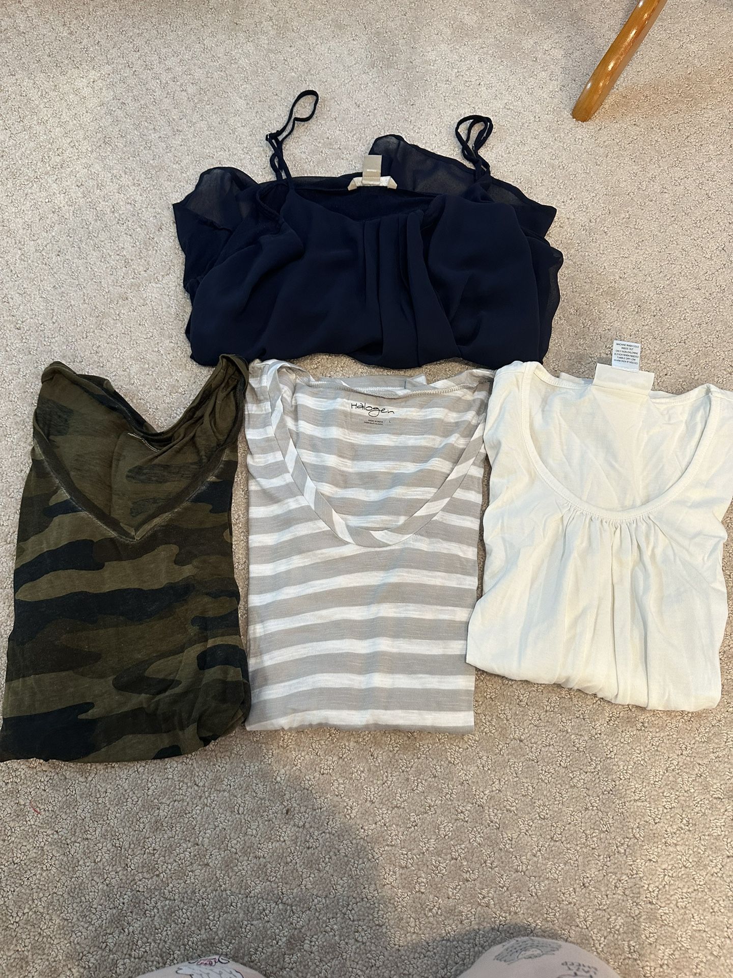 4 tops size large Halogen grey/ Wht striped V neck T - shirt North style Wht sleeveless top Lucky Brand camouflage v- neck T- shirt Banana Republic navy cami All in very good condition