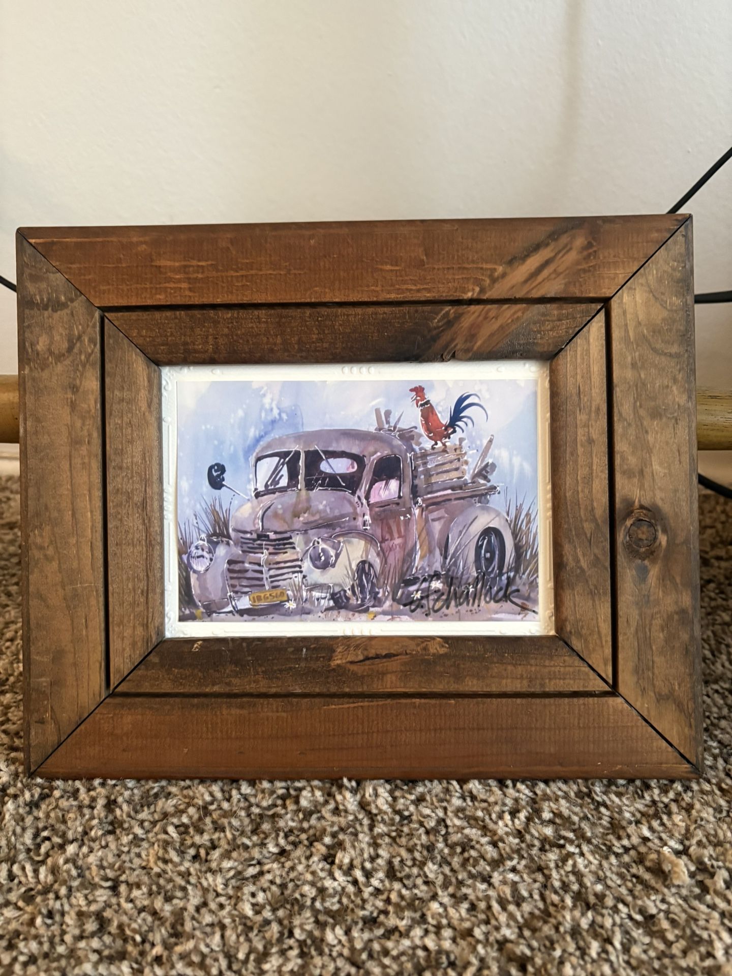 This signed print by Texas artist Dennis Schmidt captures a charming piece of country life—a rusty old truck with a proud rooster perched on top. Schmidt, a self-taught painter, became well known in the 1970s and 1980s for his wildlife and Western-themed art. While most of his work was released as limited editions, this is a signed open edition print, likely from that same period. Framed in rustic wood and ready to hang, it brings a warm touch of Southern charm to any space. Printed in the U.S. on paper using lithography, the piece is landscape-oriented and signed by the artist, making it a unique and personal addition to your home. Perfect for anyone who loves nostalgic Americana or country-inspired decor.