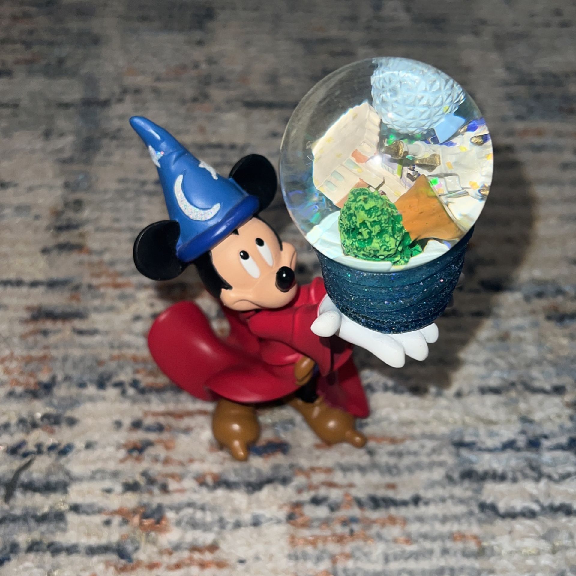Perfect condition, Fantasia’s Mickey as The Sorcerer’s Apprentice holding a functional snow globe with 4 items inside the globe representing the 4 Disney Parks at Disney World (Epcot, Hollywood Studios, Animal Kingdom, and Magic Kingdom). Great for any fan or collector!