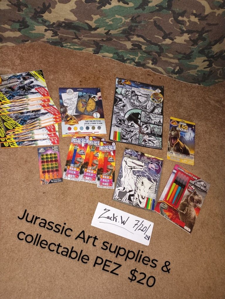 Jurassic World Art supplies and collectible PEZ 10- never opened Crayola coloring books 5- Different never used color books and painting book 1,stacked pencil set And some collectable PEZ Dispensers disclaimer "NOT INTENDED FOR EATING" expired buyer eats at own risk $20 for all!