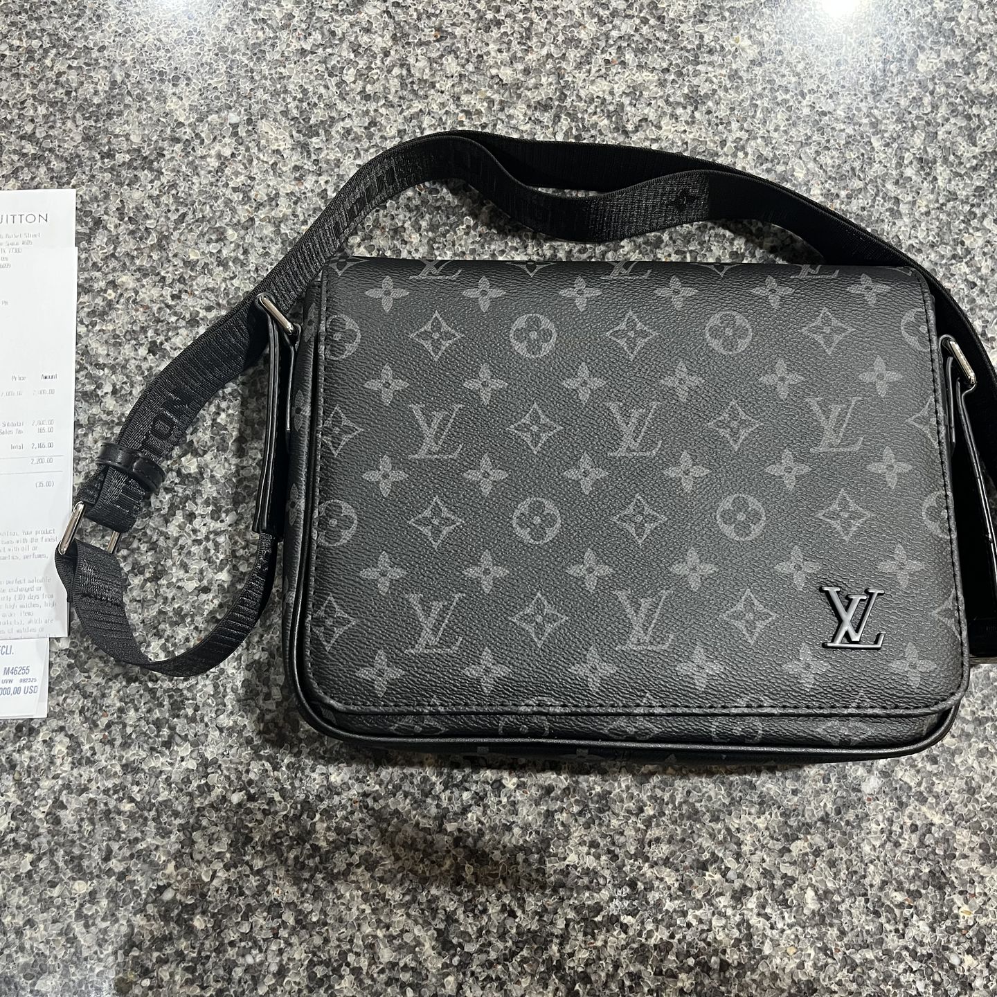 Authentic Louis Vuitton District PM crossbody bag in Monogram Eclipse canvas (black/grey). Clean condition with no rips or tears. Zipper works smoothly, strap is adjustable, hardware looks great. Includes original Louis Vuitton receipt (see photos). Perfect everyday bag or gift. Local pickup only. Cash preferred. Serious buyers only.