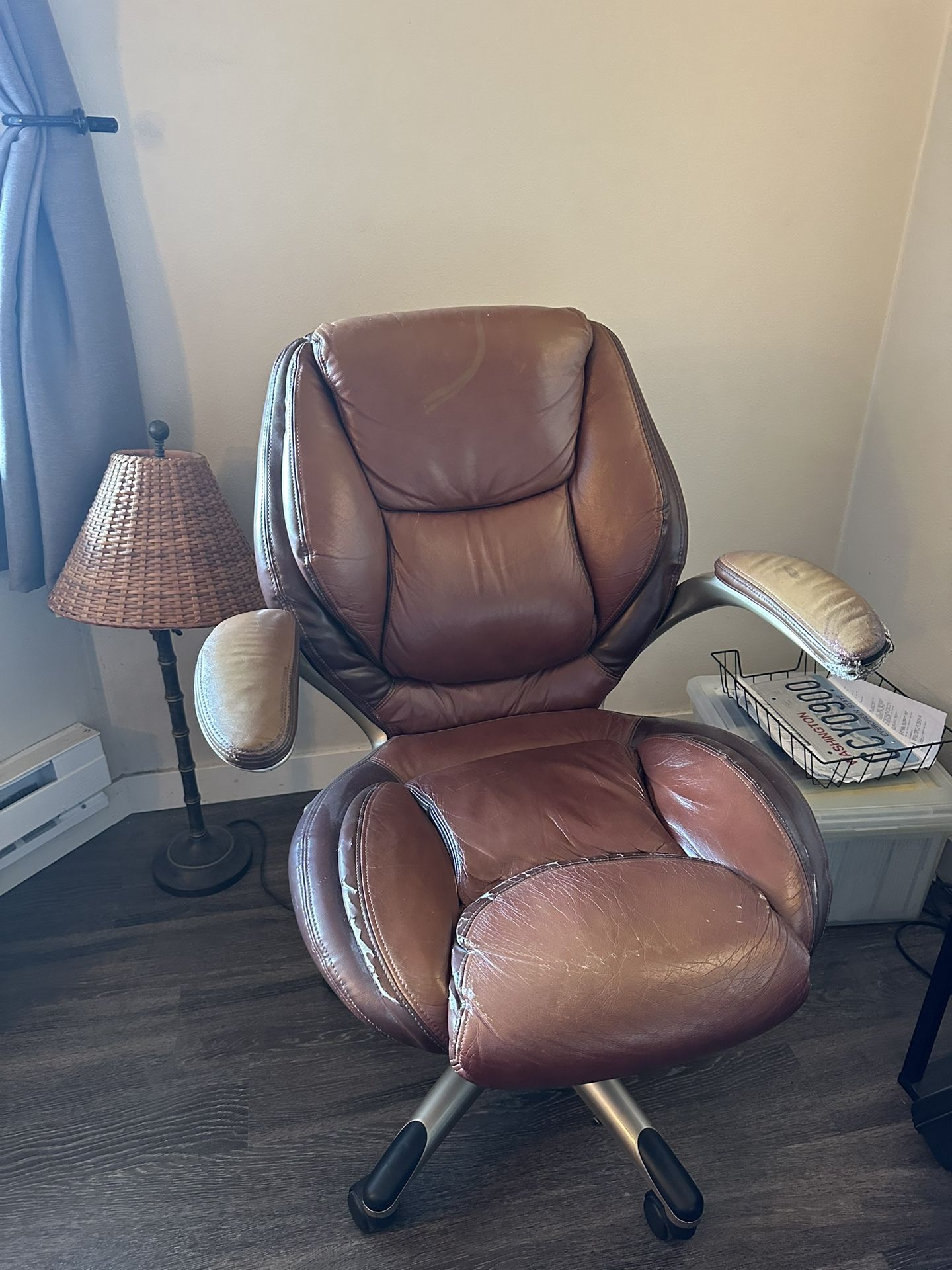Office chair bought new 10 years ago for $550. Wear and tare on the seat cushion and the arms. Great at study chair for college student.