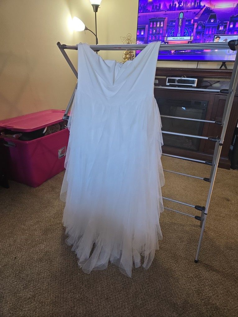 This dress has been worn one time for my 40th birthday party. She is in top notch condition it is a strapless sheer bottom and tulle fabric on the outside. The size is a 2X.