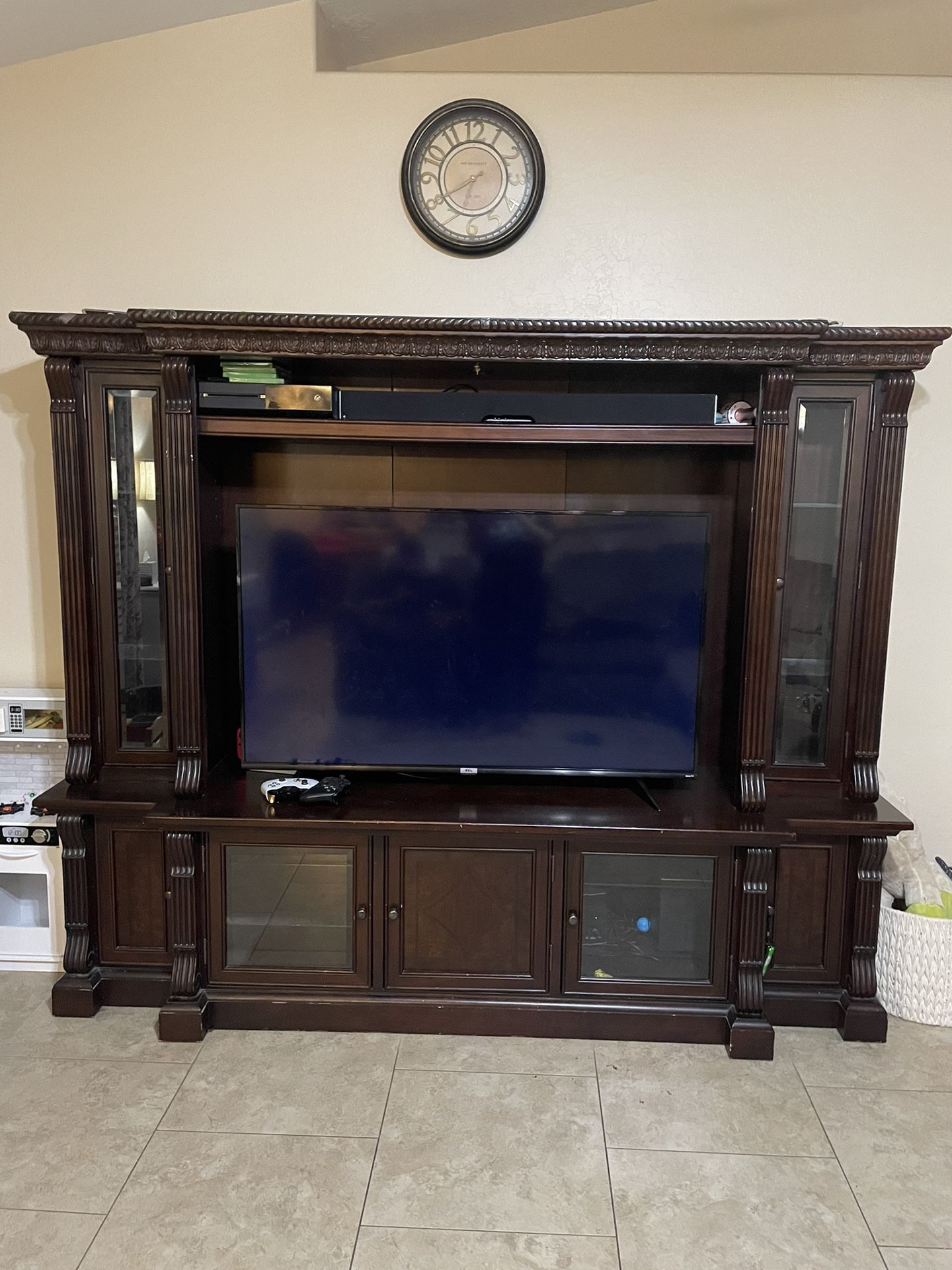 Dark brown almost black in color. solid wood entertainment center adjustable shelving and light fixtures in the top and in the side cabinets 6ft tall, 7 ft wide and sticks out about 2 ft.