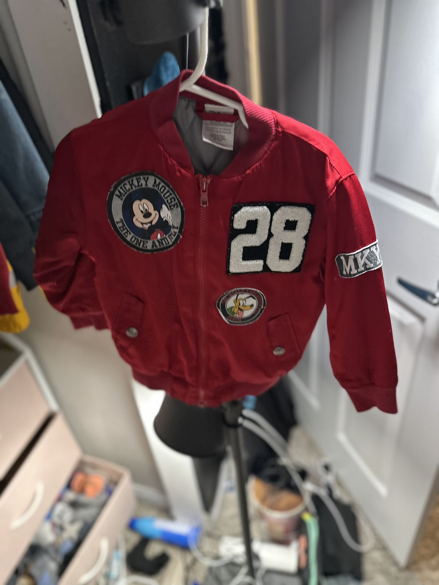 Make your toddler the coolest kid on the block with this bold and stylish Mickey Mouse bomber jacket! π Size: 3T (Perfect for toddlers aged 2β3 years) π― Features: β’ Iconic Mickey Mouse patches + Pluto detail β’ Soft, warm, and lightweight β’ Zip-up front and snap-button pockets β’ Red & black varsity-style design β’ Unique β28β patch and MKY arm badge β’ Great condition β barely worn Perfect for Disney lovers and streetwear-inspired kid fashion. π§Ό Washed and ready for its next little legend.