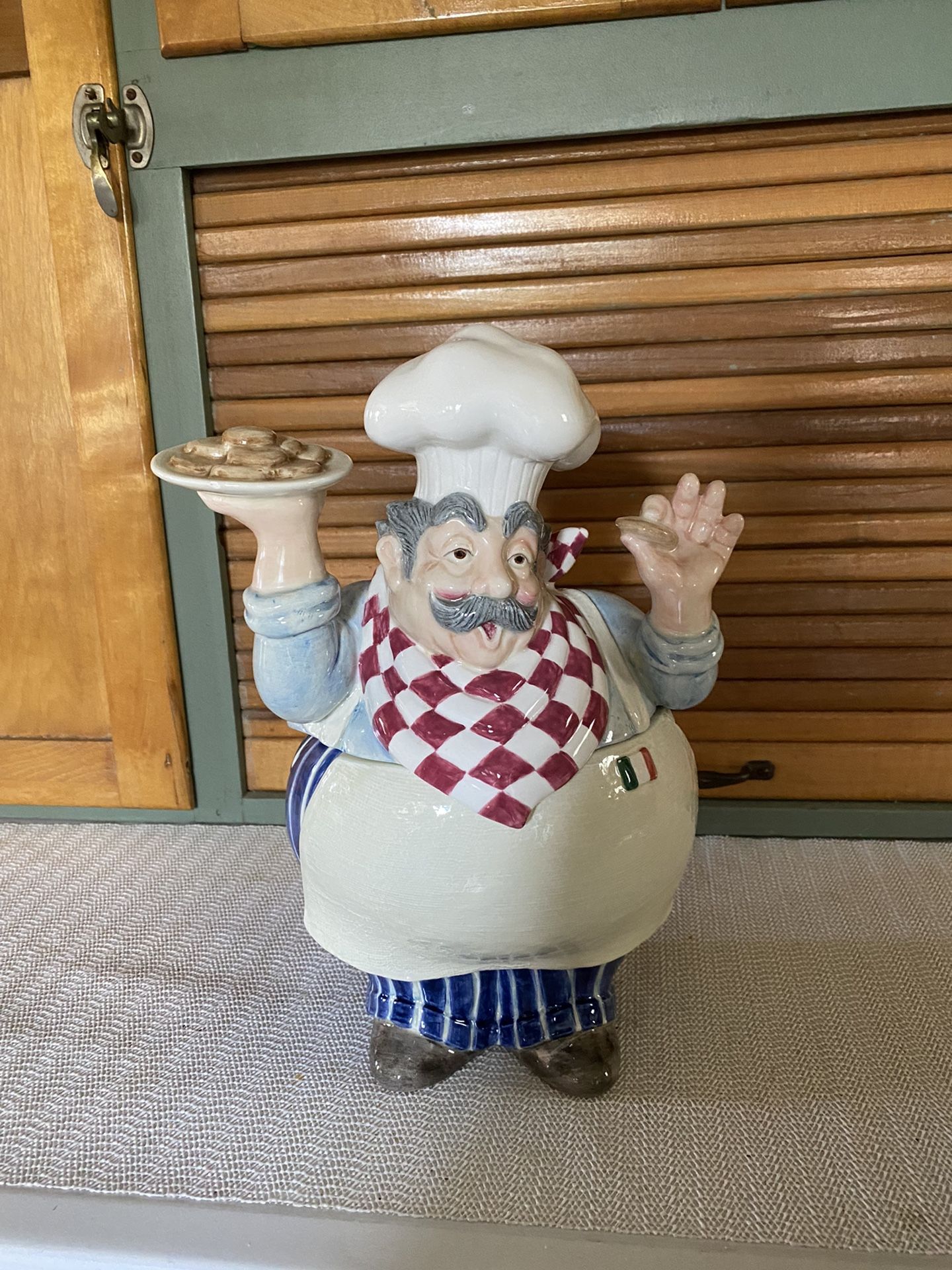 Nice Cookie Jar featuring a fat baker holding a plate of cookies. It has a couple chips inside the bases rim that don’t show and a tiny one on the edge of the plate. Not old. Cross selling.