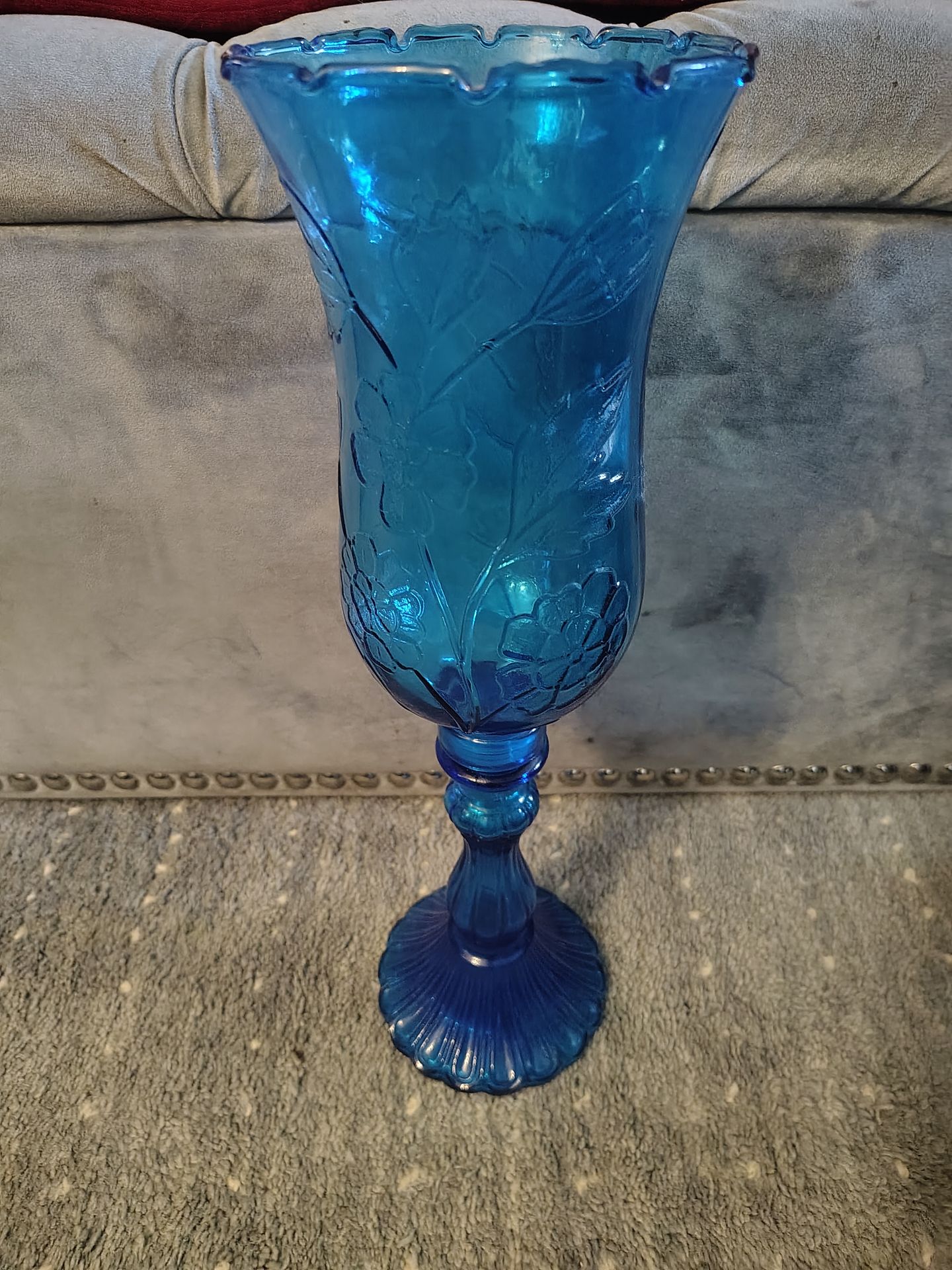 Vintage cobalt blue pressed glass pedestal vase with floral pattern and scalloped rim. Great for flowers, centerpieces, or décor. About __ inches tall. No cracks or chips.