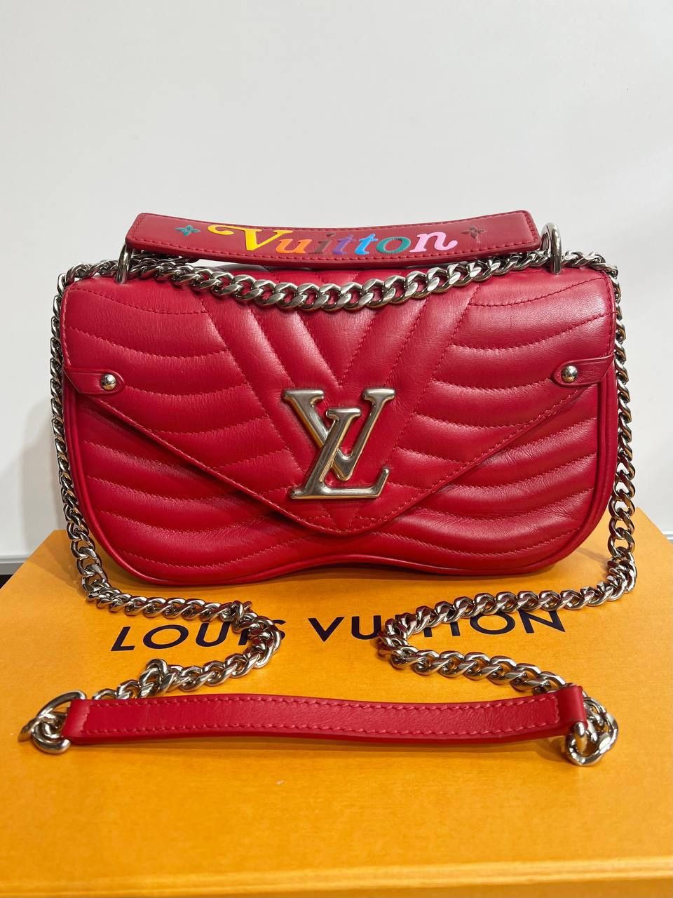 Louis Vuitton New Wave Chain Bag Quilted Leather MM Red M51943. Bag comes with original box, have some a few dents in the leather on the back side and on the inside of the lid as pictured, also have some scratches on a leather in the area of the multi-colored handle. Silver details has some scratches. Inside bag clean in very good condition, no spots. All in all it’s a nice beautiful bag. The best choice for you!