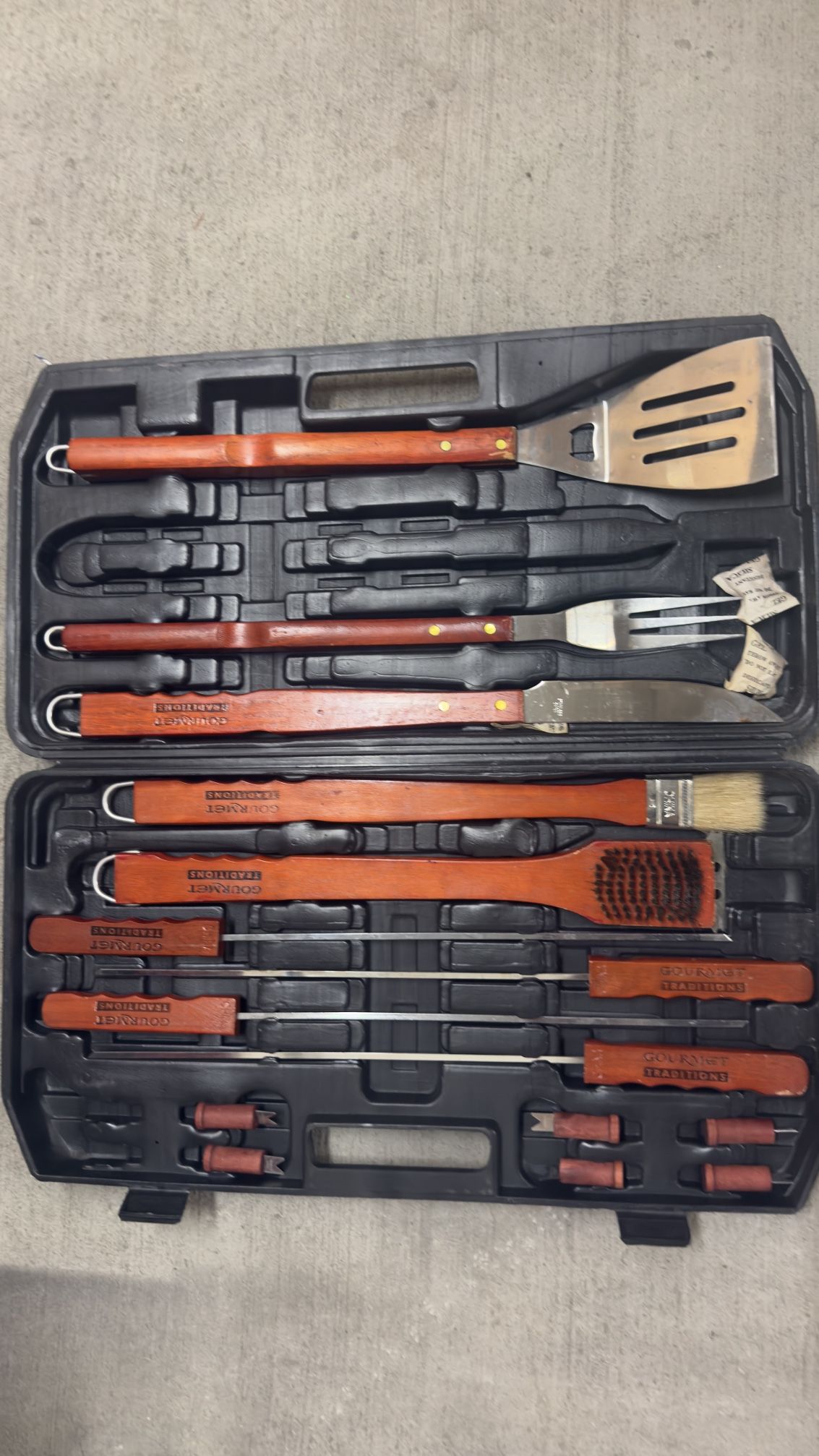 Brand New, never used but missing the tongs For the grill master in your life, the product is the perfect all-in-one bbq tools set conveniently secured in a highly-portable and lightweight molded-plastic tote. All grilling utensils are stainless steel with lovely wooden handles, looped at the ends for easy hanging on the bbq. Grilling tools include: one spatula with built-in bottle opener, missing the tongs, one fork, one knife, one basting brush, four shish kabob skewers with sliding medallions to remove food with ease, eight corn cob holders, and one grill brush with scraper. Fire it up! Features Molded plastic case that's compact - easy to carry and stow away when not in use All tools made of stainless steel with beautiful wood handles and loops at the ends so they can hang from your barbecue