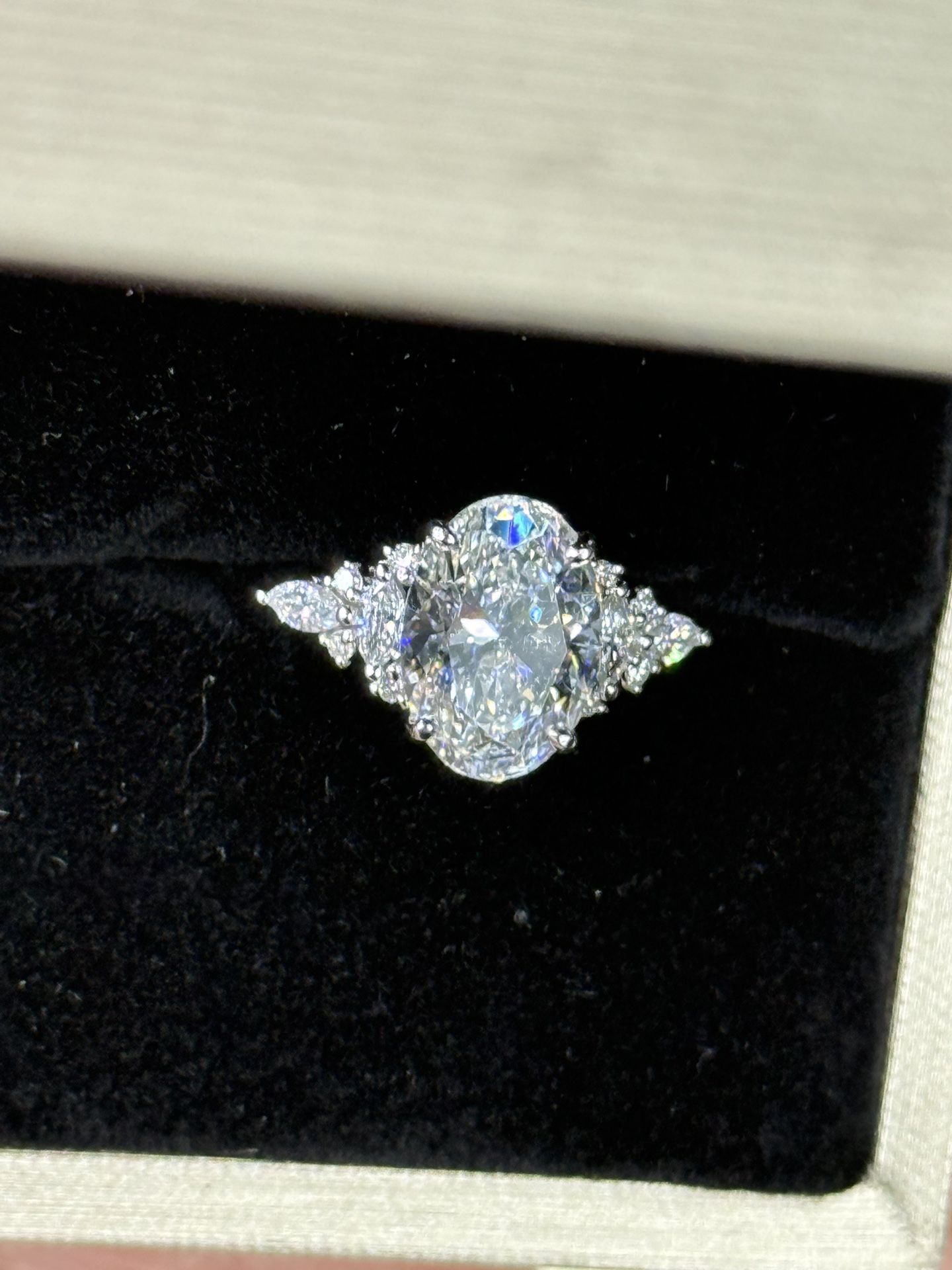 3.13 CT OVAL GIA CERTIFIED LAB GROWN VVS2 D COLOR 3X 18K WHITE GOLD BAND VVS ACCENT DIAMONDS SIZE 4 BUT CAN BE RESIZED AT YOUR COST.