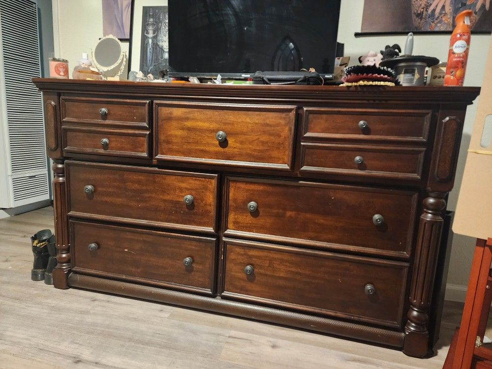 This bedroom dresser is in good condition, mirror is also in good condition. All 7 drawers slide open easily. There are feet the belong on the bottom of the dresser as well that are included just not shown. Looking to sell this ASAP. Will need multiple people to take out and transport to a truck or Uhaul, whichever you're using, it is a very hefty dresser. Only flaws are a slight ding in the back of the dresser, its too heavy for only myself to move. Other than that, its in very good condition.