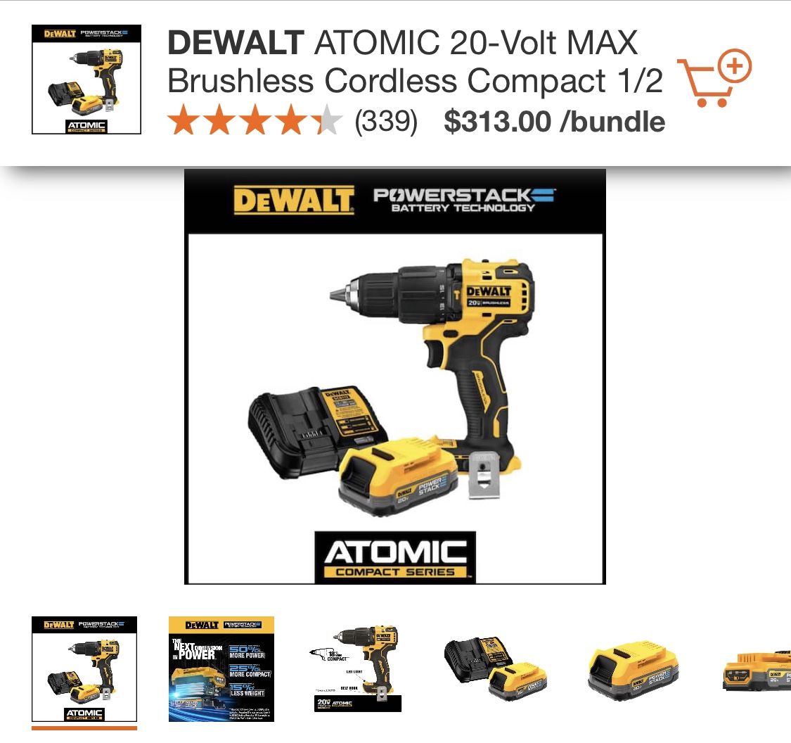 Brand new DEWALT ATOMIC 20-Volt MAX Brushless Cordless Compact 1/2 in. Hammer Drill w/20V POWERSTACK Compact Battery Charger and bag