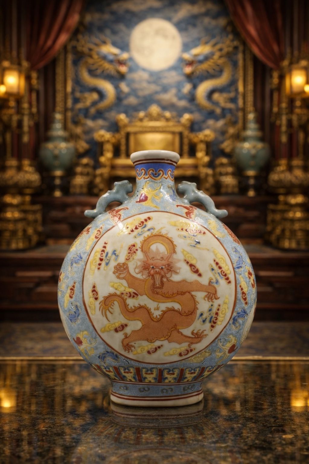 A Qianlong period (1(contact info removed)) luminous porcelain famille rosy flat bottle with auspicious cloud and dragon design, antique style, for home decoration and collection. Imperial Multicolor Dragon Moon‑Flask Vase This magnificent porcelain moon‑flask features a flattened circular body and a short, elegant neck adorned with sculpted dragon‑shaped handles. The central medallion depicts a five‑clawed imperial dragon in vivid red and gold, coiling around a flaming pearl amid swirling clouds — a symbol of power, wisdom, and celestial energy. Surrounding the dragon are intricate cloud and flame motifs in blue, yellow, and crimson, rendered with exceptional precision and balance. The rim and base are framed by ornate geometric and floral borders in cobalt blue and gold, harmonizing with the vibrant palette. The craftsmanship reflects the grandeur of Qing‑dynasty imperial aesthetics, where color, symbolism, and form unite to express authority and divine protection.