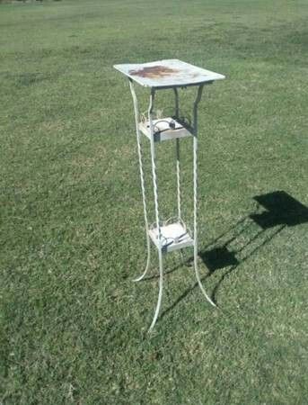 $118 Firm. Unique 3 tier perfect mid century vintique table with barley twist detail iron legs, 3' 7" tall. 3 steel or iron shelves - top 16" wide 10" deep, leaf detail borders the two lower shelves these are 6" square inches. It formally was a bird cage stand but can be used for many applications - entry table, lamp table, accent table, plant stand, etc. Weighs roughly 20 lbs. There's no holes on the top, just surface rust. This can be refinished many a cool finish and value double what you paid if you decided to get of it. Excellent VinTiQue condition. * If Price Isn't Fit You Please Do Not Inquire/Meet, NO HOLDS!