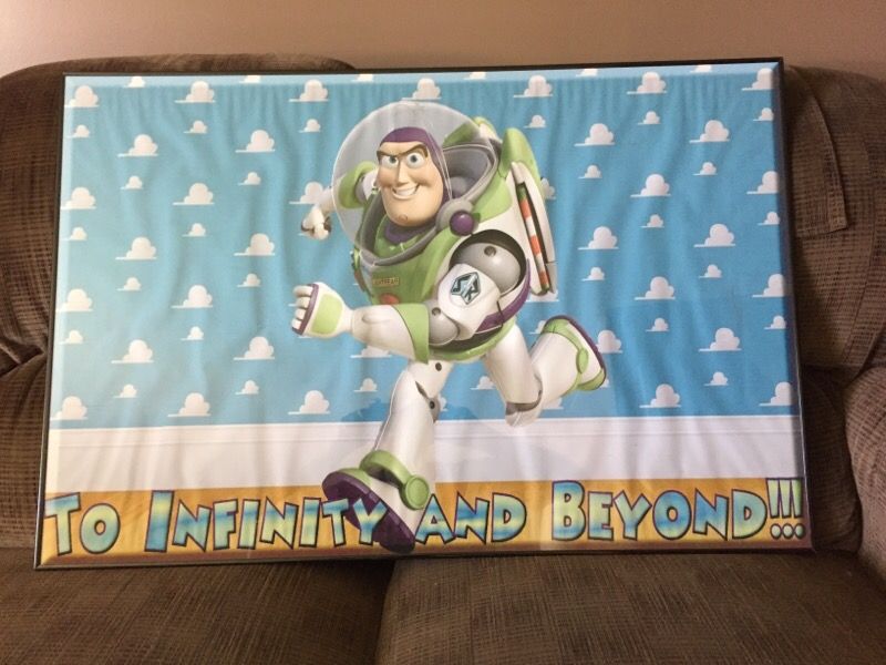 Up for sale is a framed poster of Buzz Lightyear. At the bottom is a quote-To infinity and beyond.