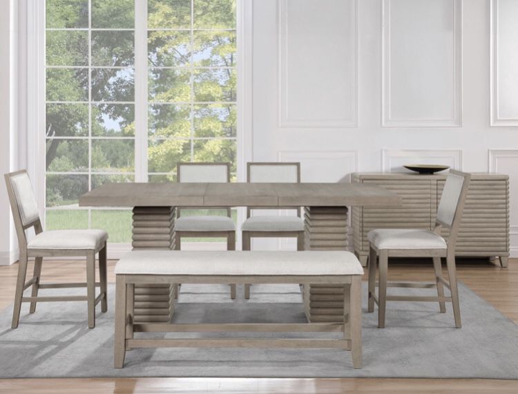 New item sale Table, 4 chairs & bench ONLY $999!! Was $1399 Griege Solid Wood 60” expands to 78” Seats up to 8 Also Available in Regular Dining Height Message us for payment options & delivery fees SS Lily CS