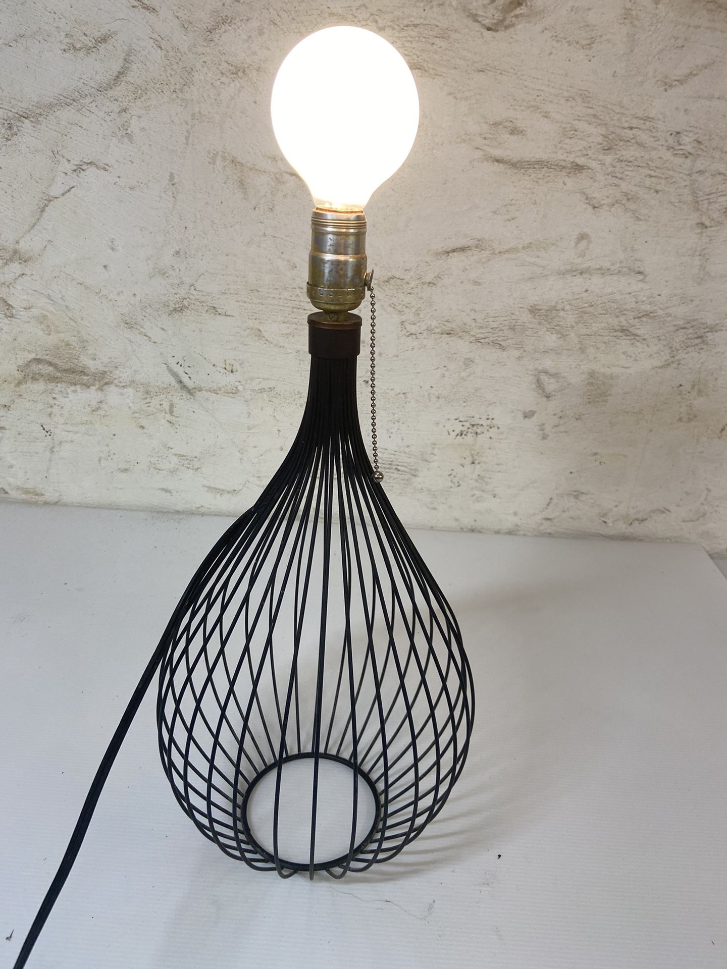 Mid century black metal wire lamp Working condition 22” tall top of bulb 5” round base that projects up larger As/is
