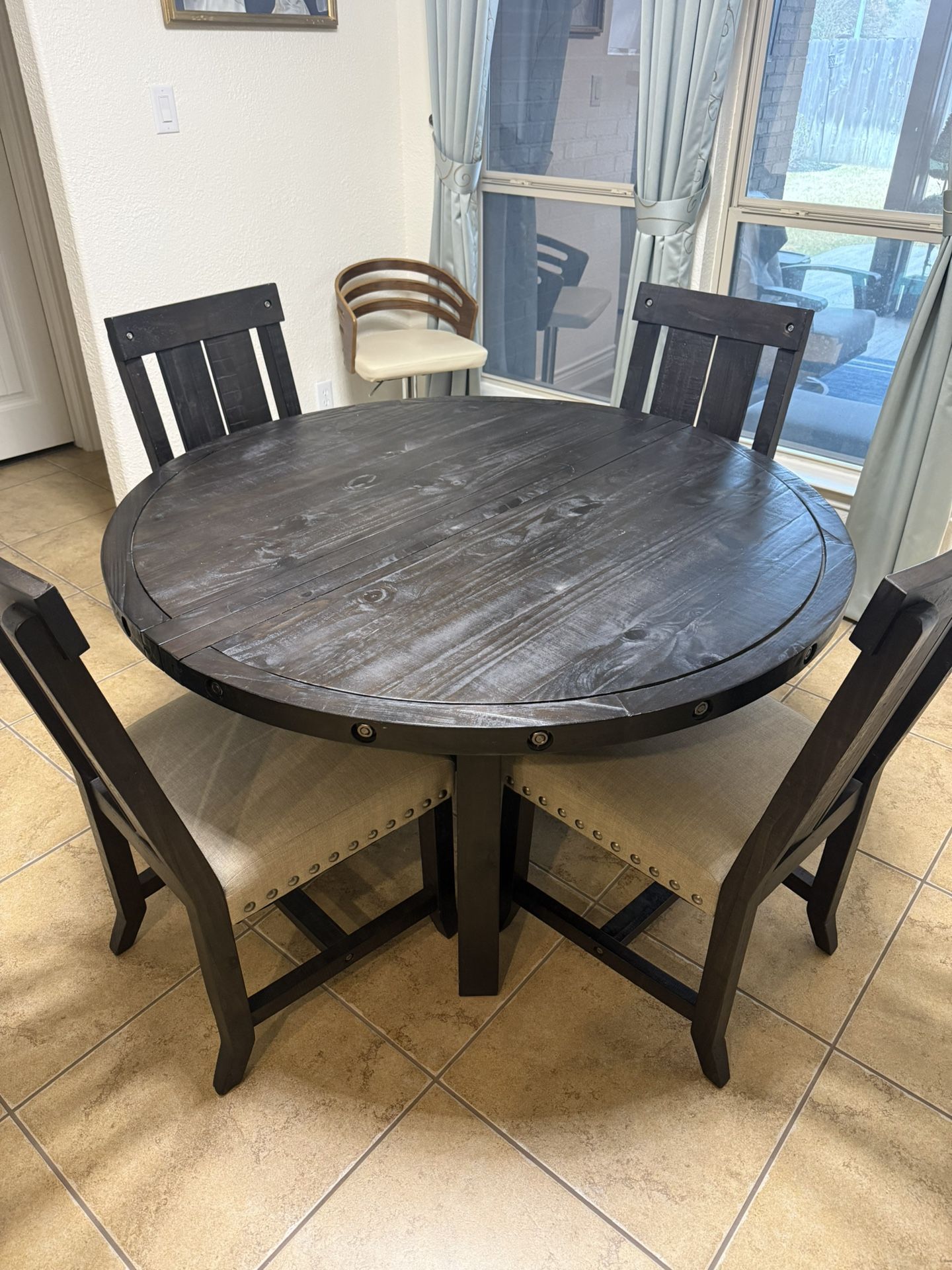 Beautiful solid wood round dining table with 4 chairs. Dark espresso finish with rustic wood grain detail and metal accent studs around the table edge for a modern farmhouse look. Chairs include four upholstered seats with nailhead trim and two matching wood-back chairs. Perfect size for a kitchen or breakfast nook. Sturdy, well-built, and in great condition with minimal wear. Great statement piece that’s both stylish and functional.
