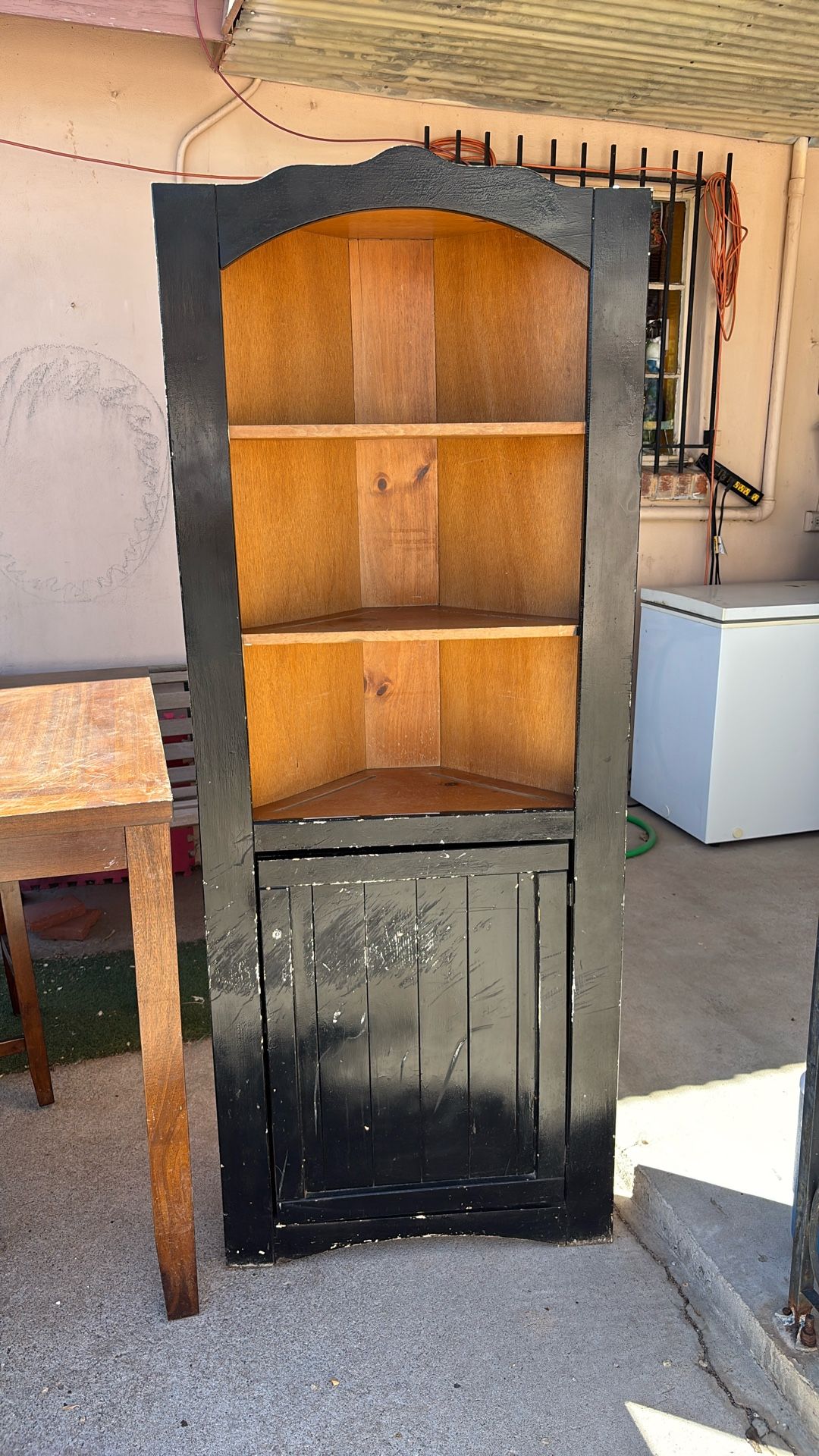 This is an older caddy corner shelf piece of furniture. The bottom door has some scuff marks but can be easily painted with black paint or remove the whole door to reveal more shelving. OBO