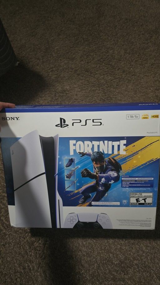 Selling a brand new, Sony PlayStation 5 (PS5) Fortnite Edition bundle. Includes: - PS5 console (1TB SSD) - DualSense wireless controller - Exclusive Fortnite content: outfit, back bling, pickaxe, wrap, and 1,000 V-Bucks - Supports 4K HDR