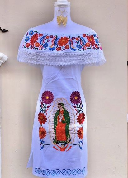 Vestidos bordados con imágenes de la Virgen de Guadalupe, estilos disponibles,con resorte en la cintura o sin resorte ,colores disponibles en amarillo,blanco y negro -Tallas disponibles desde la S- M -L -XL