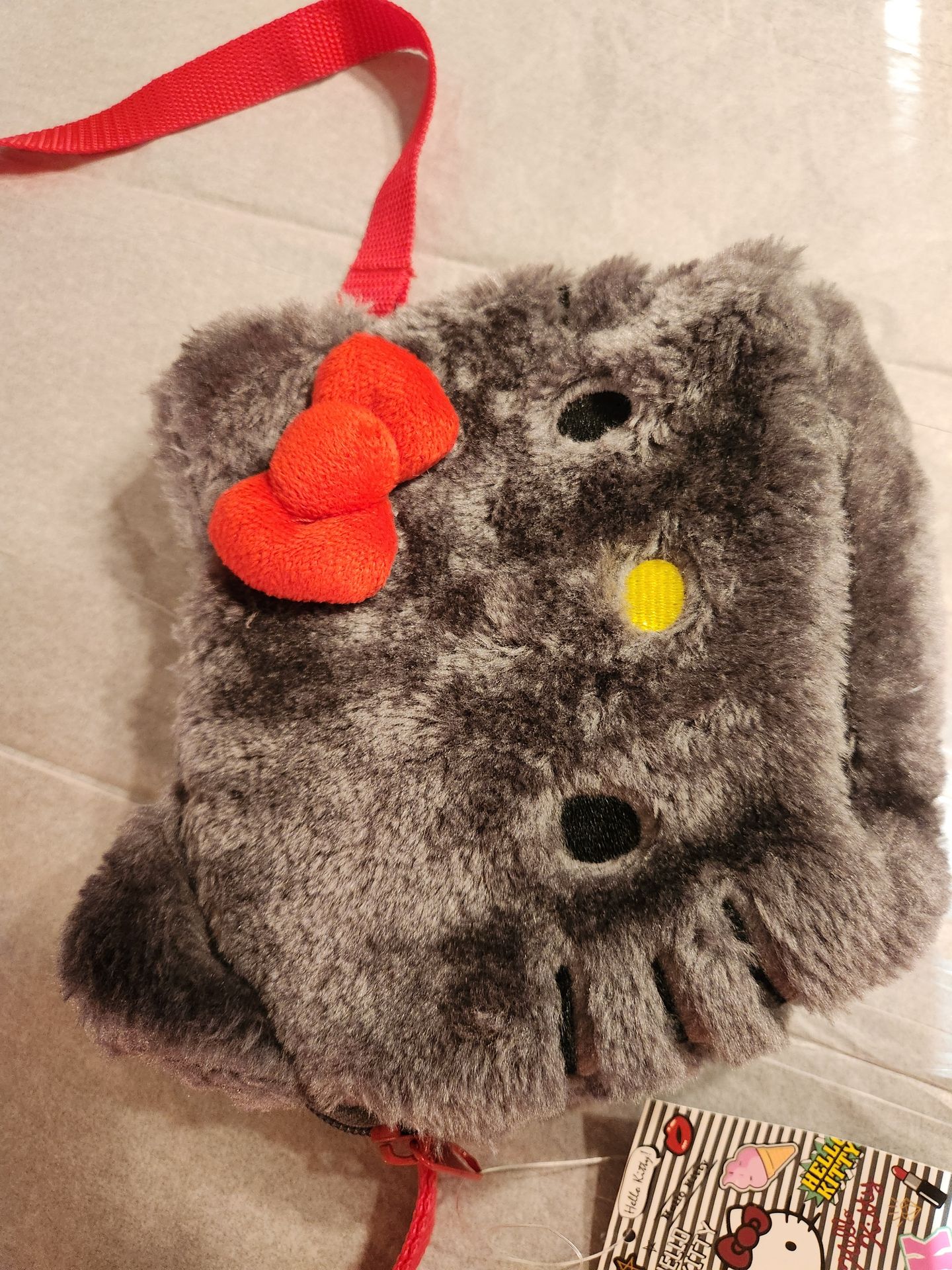 Hello Kitty, Grey plush crossbody or shoulder bag. Zippered closure with one inner slip pocket and red strap. Small gift, big smile! #Sanrio #HelloKitty #Anime