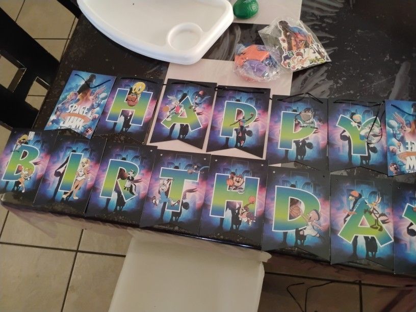 Space Jam Birthday Banner, Balloons And Cake Topper